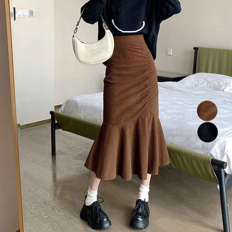 裾はふわりとなびく女性らしさが引き立つマーメイドシルエットのミモレ丈スカート