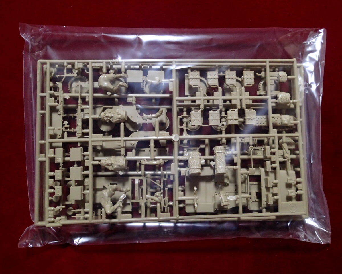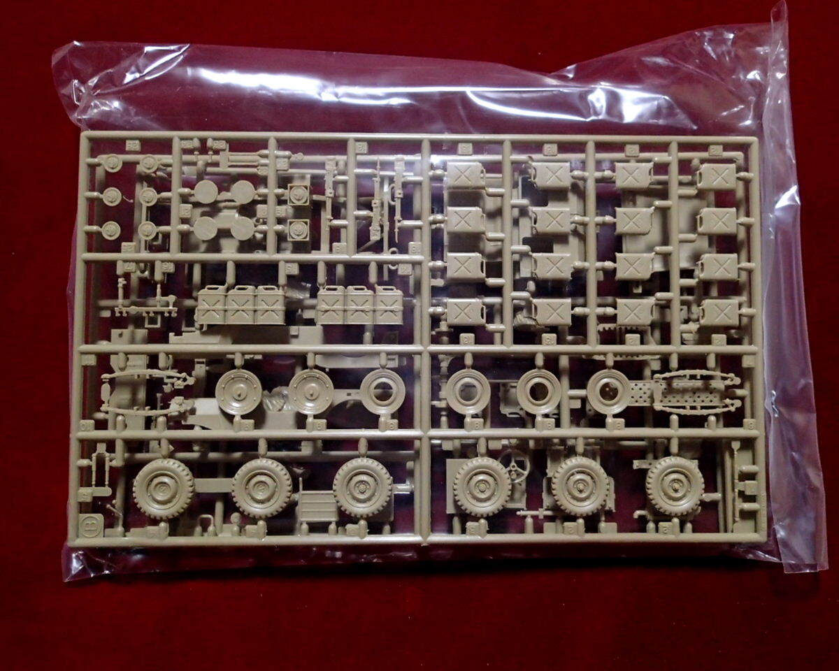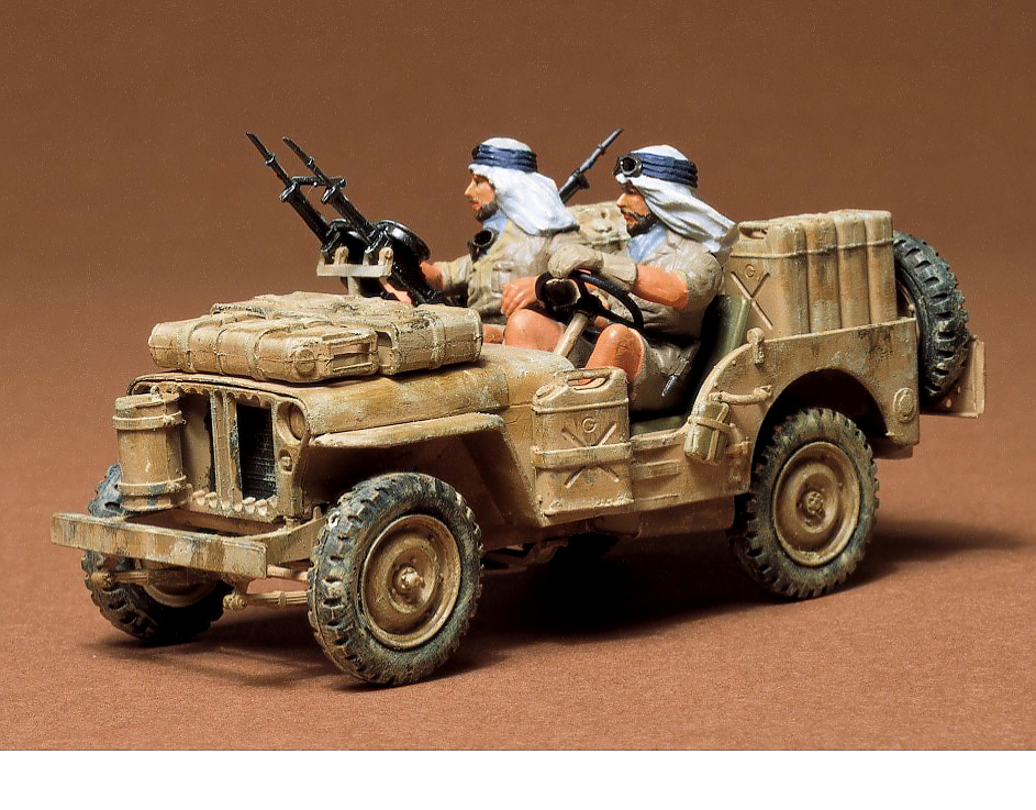 ●第2次大戦中の北アフリカ戦線で活躍したイギリス軍特殊部隊(SAS)が使用した砂漠仕様ジープです。漠地帯を長距離移動するために様々な改造が施されたジープが実感豊かに再現されています。ターバン姿の英軍兵士の乗員(2体)のほか、ブローニングM2重機関銃やビッカース連装機銃の重武装、予備燃料タンクやジェリカン、スペアタイヤ、脱出用サンドチャンネル等がセットされています。