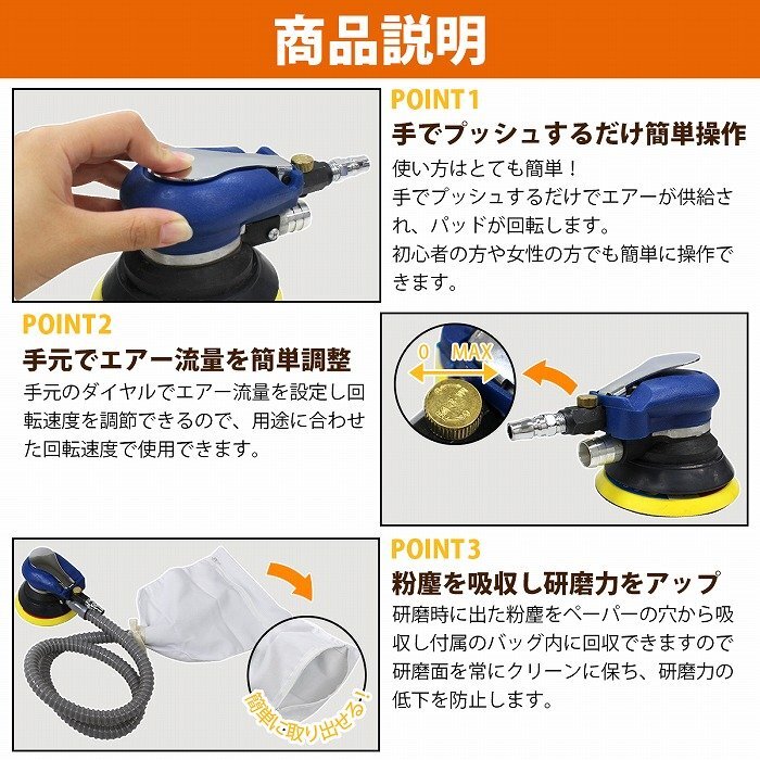 板金 塗装 パテ 研磨 集塵式 オービタル エアー サンダー 磨き 塗装 パテ 剥離 吸じん ダブルアクション エア サンダー 125mm