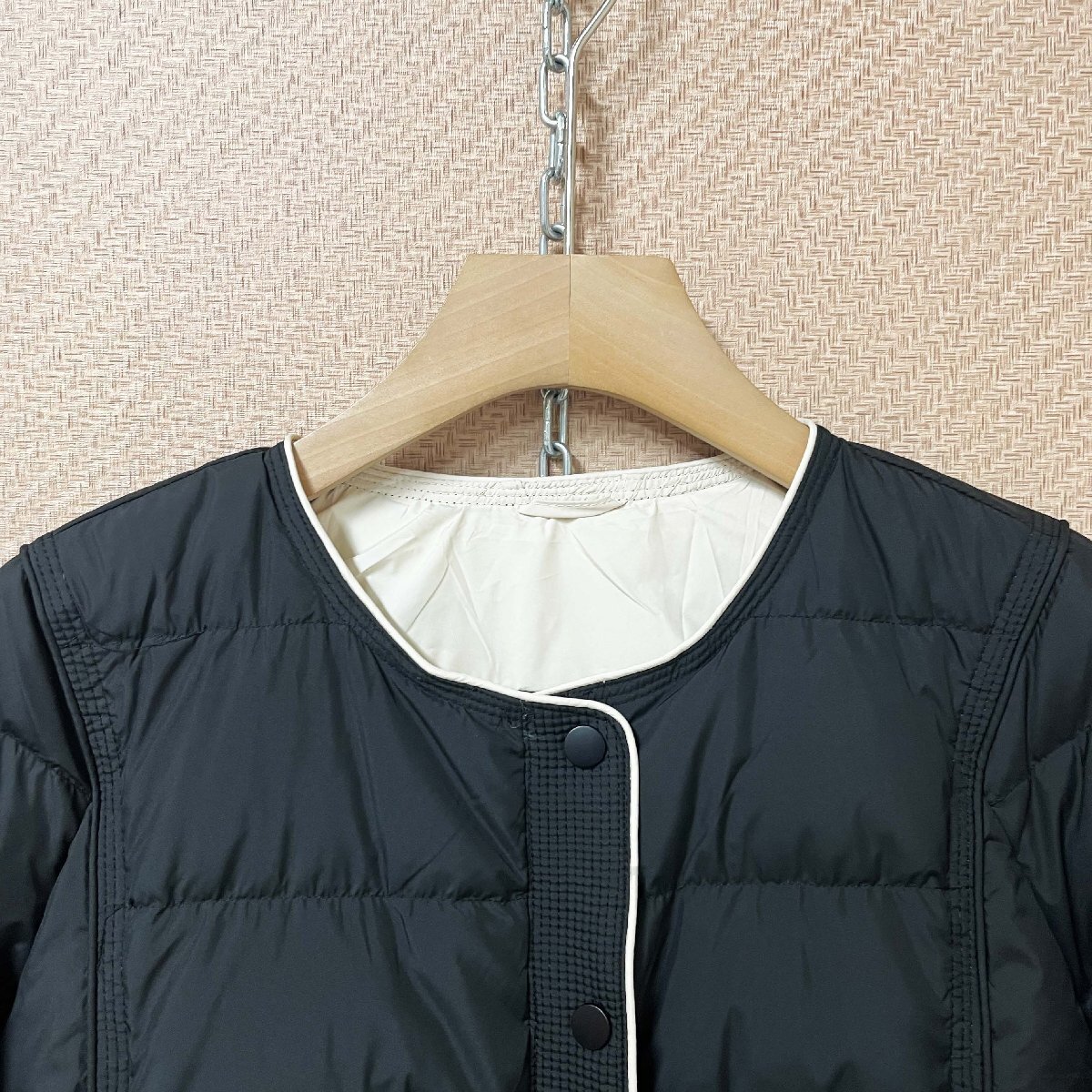 デザインは顔まわりをすっきり見せてくれる丸首タイプ。全体は無地のシンプルな仕上がりながら、正面にはさりげないラインのデザインを取り入れており、着ぶくれしにくく、自然と体のラインをきれいに見せてくれます。ショート丈で動きやすく、バランスがとりやすいので、合わせやすい万能さも魅力です。
