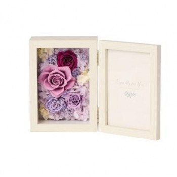 | バラとあじさいの小花がフェミニンな印象のフォトフレーム型のアレンジです。メッセージカードを入れて贈り物にもぴったりです。 |