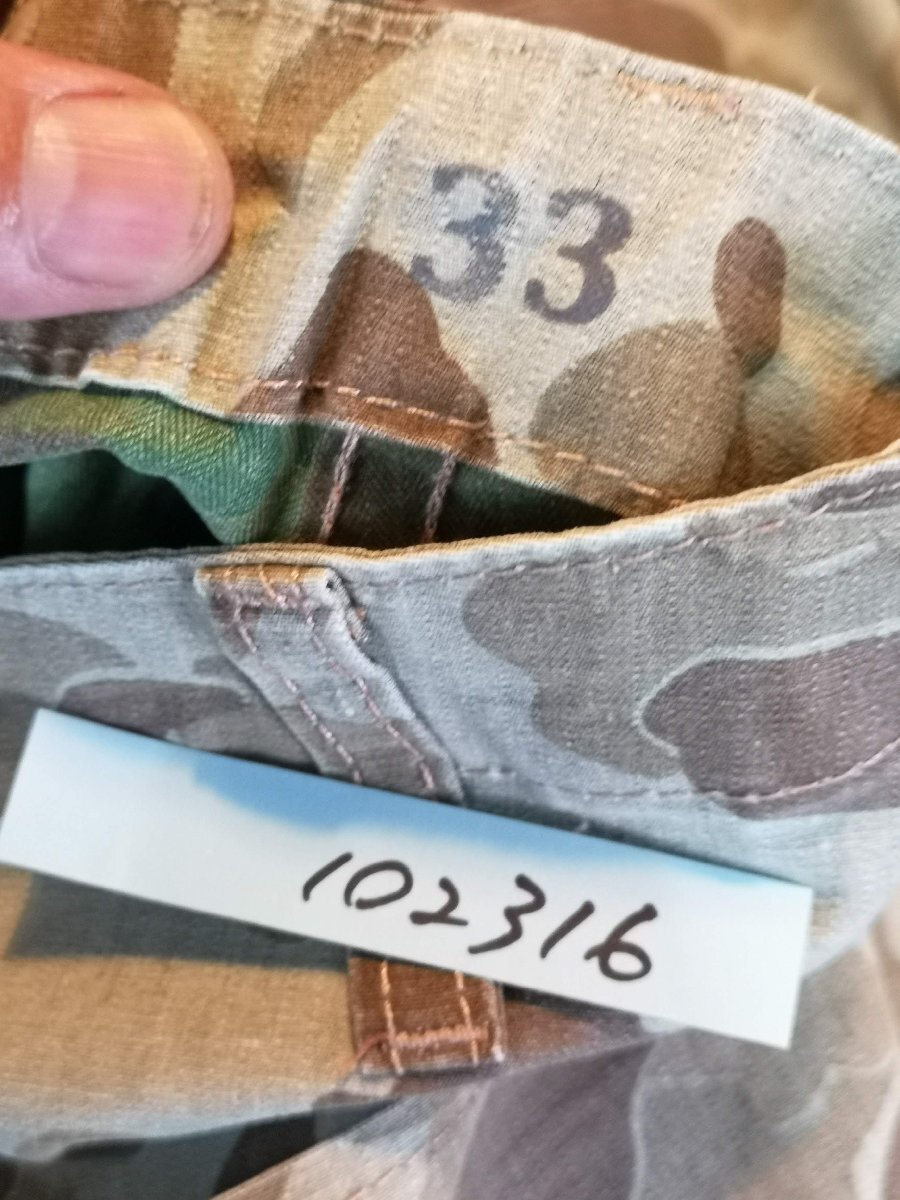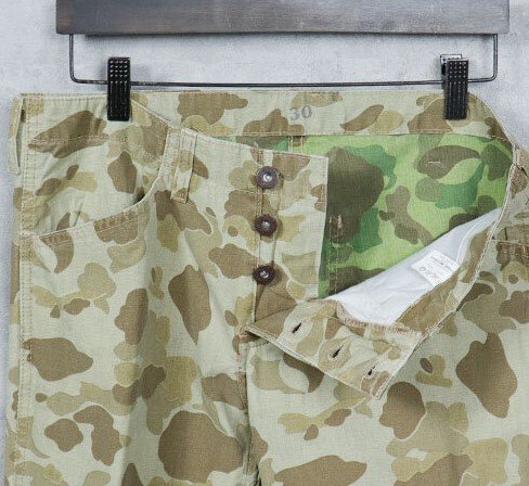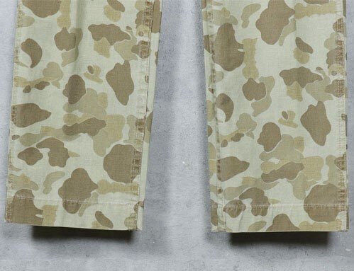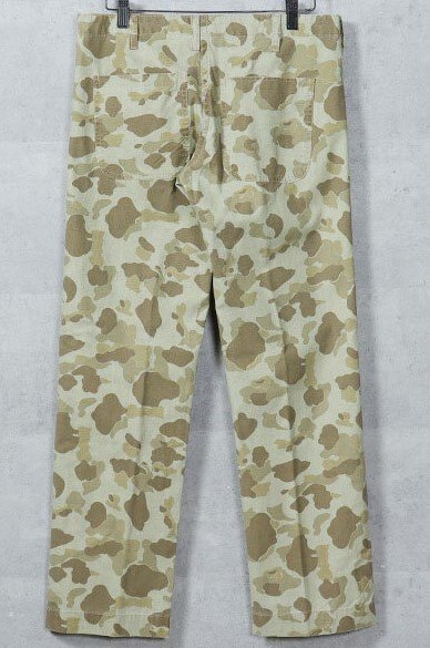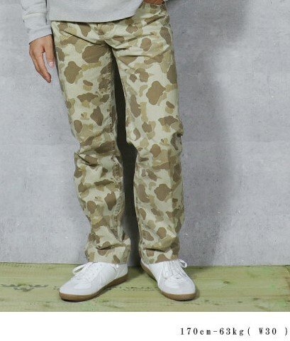 USMCのレプリカ、ダックハンターカモ迷彩のロングパンツです、ヘルメットカバーなど限定的ではありましたが60年代半ばまでは海兵隊で採用されていました。 生地自体はリバーシブルになっておりますが、裏返しでは着用できません。P41 HBTパンツの後期型をモチーフに、わたりなどは細身に製作してあります。 サイズ30( ウエスト82cm/総丈97cm/股下73cm/もも幅24cm/裾幅20cm ) 32( ウエスト90cm/総丈98cm/股下74cm/もも幅25cm/裾幅21cm ) 33( ウエスト93cm/総丈98cm/股下74cm/もも幅25cm/裾幅21cm ) 35( ウエスト97cm/総丈98cm/股下76cm/もも幅26cm/裾幅22cm ) 素材:コットン100% 沖縄離島を除く全国元払い500円でお送りいたします。落札価格にプラスでお願いします。