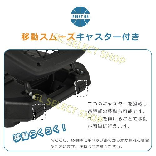 • 【移動スムーズキャスター付】移動らくらく! 二つのキャスターを搭載し、遠距離の移動も可能です。ゴールを傾けることで移動が簡単に行えます。 ※ただし、移動時にキャップ部分から水が漏れる場合がございます。移動はご注意ください。