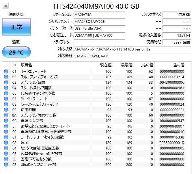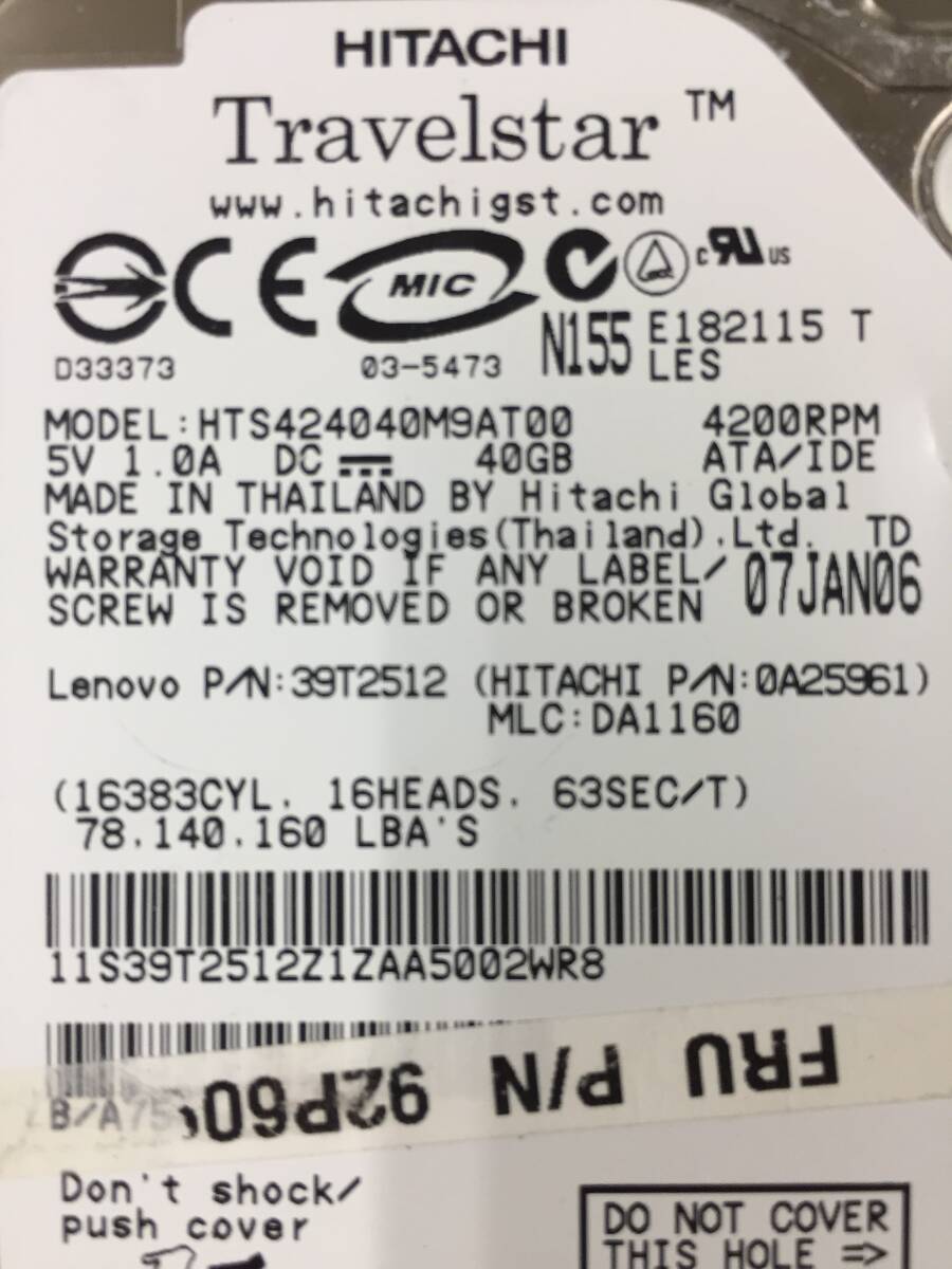 | a◇3297時間 HITACHI/日立 HTS424040M9AT00 2.5インチHDD 『正常判定』 40GB | |