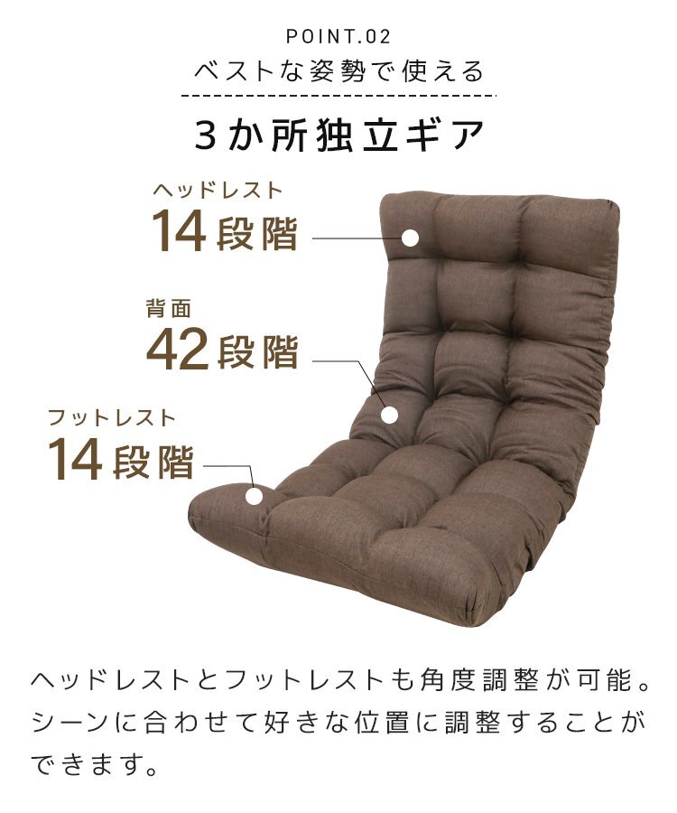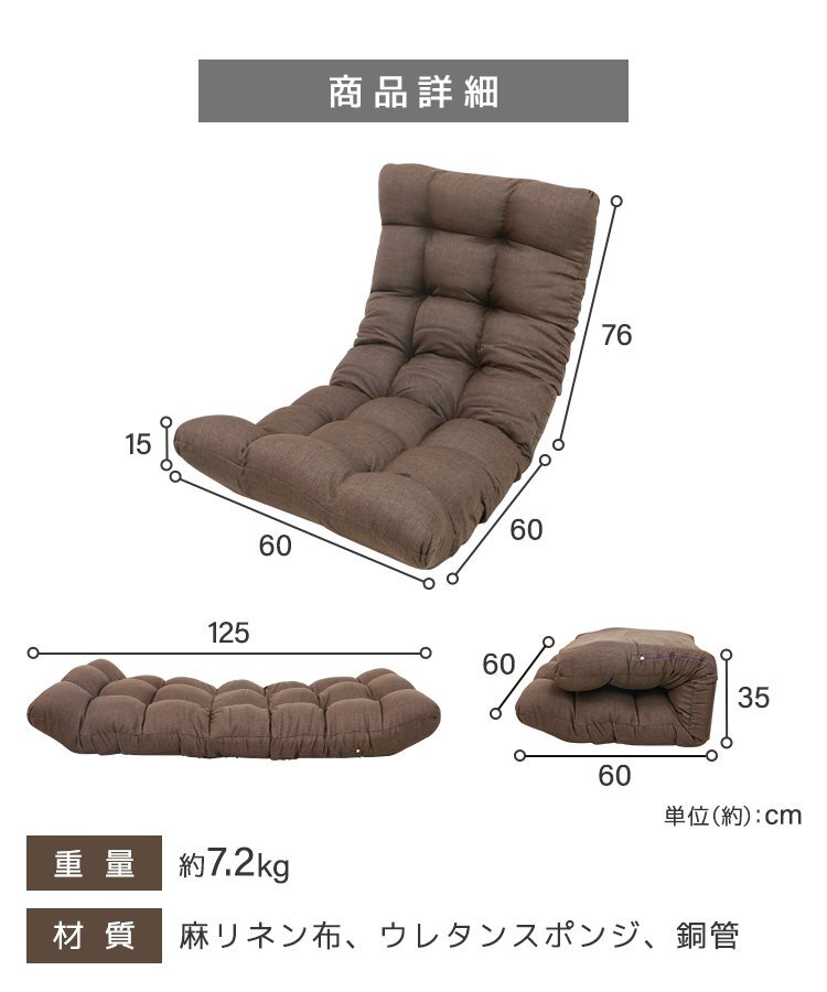 | ふんわりとした座り心地で体に優しくフィットする座椅子です。 大事な内部ギアは、世界でも活躍する実績ある日本メーカー「KoYo」の日本製! 42段階リクライニングで、曲げて、伸ばして、広げて・・・くつろぎ方、選び放題です♪ スマートロックギア搭載で、座ったまま、お好みの角度に調整ができます。 【商品詳細】 カラー:ブラウン サイズ(約)幅60x奥行60x高さ76cm 座面厚み:(約)15cm 収納サイズ:(約)幅60x奥行63x高さ35cm 重量(約)7.2kg 素材:麻リネン布、ウレタンスポンジ、鋼管 【注意事項】 ・この商品はカバーリングではありません(洗濯不可) ・生産ロットが違う場合、柄・色味が若干変わってくる場合がございます。 ・商品を使用して発生した事故・トラブル・破損等につきましては一切の責任を負いかねます。 ・商品は、モニターによって色合いが異なって見える場合があります。 ・仕様・デザインは改良のため予告なく変更することがあります。 |
