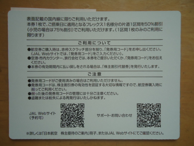 詳しくは、「日本航空 株主優待のご案内」または、JAL Webサイトにてご確認ください。