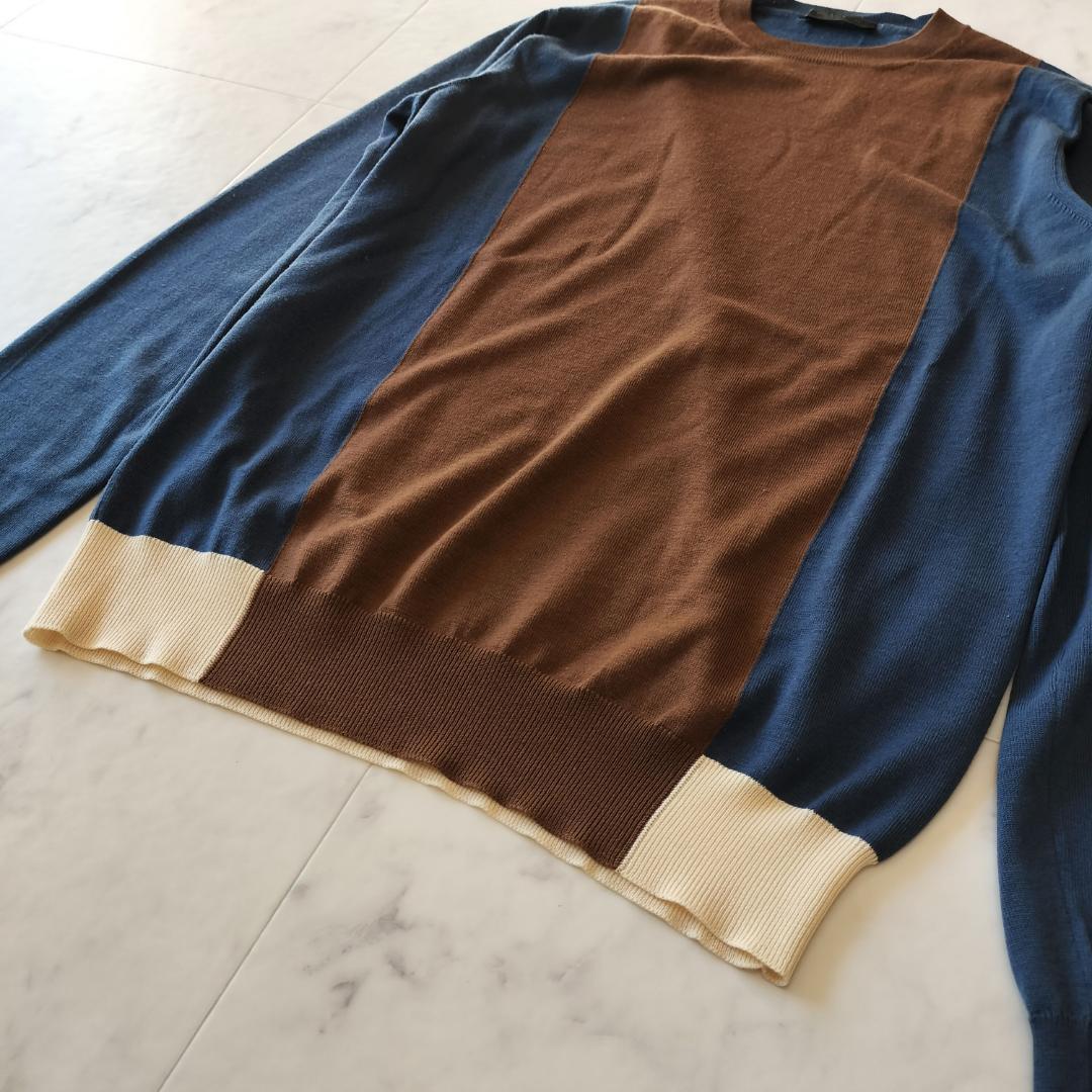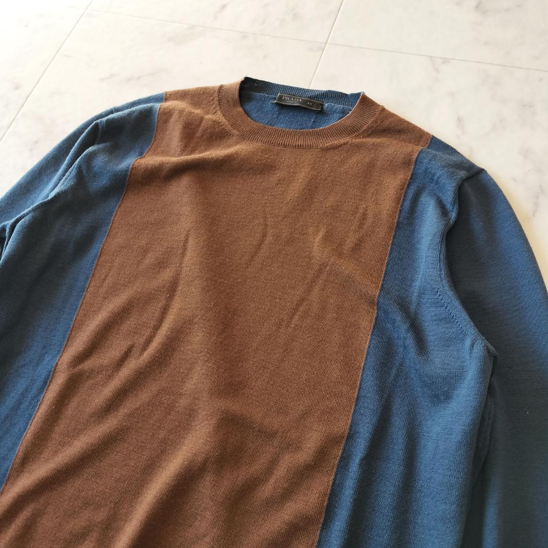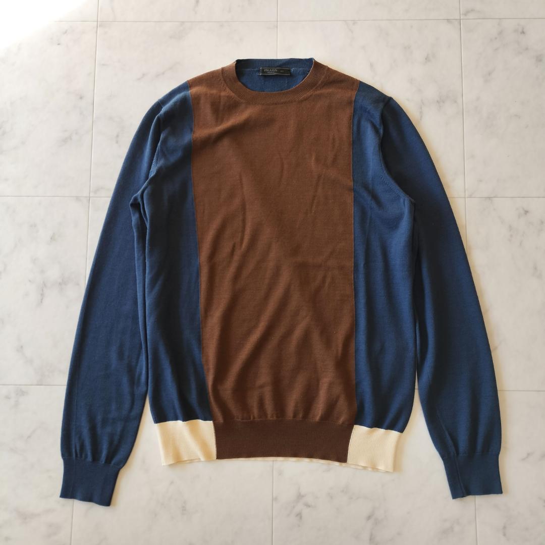 PRADA プラダ カラーブロック ニットセーター ブルー ブラウン 青 茶色 ウール100% ハイゲージニット イタリア製 made in Italy 2015年 アーカイブ archive メンズ クルーネック 長袖 バイカラー Color block knit sweater blue brown wool