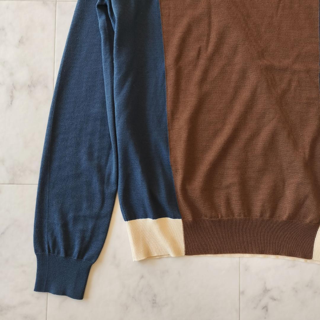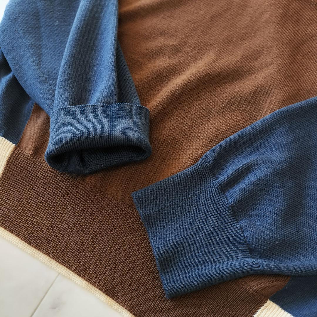 フロント部分はブラウン、袖部分はブルーで切り替えられた洗練されたカラーブロックデザイン。裾のリブ部分はアイボリーカラーがアクセントとして配され、全体のバランスを絶妙に整えています。