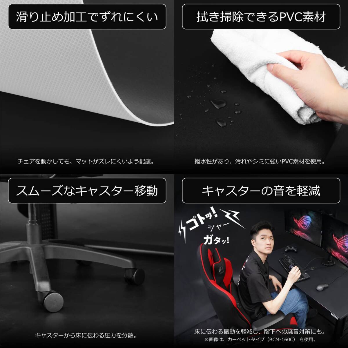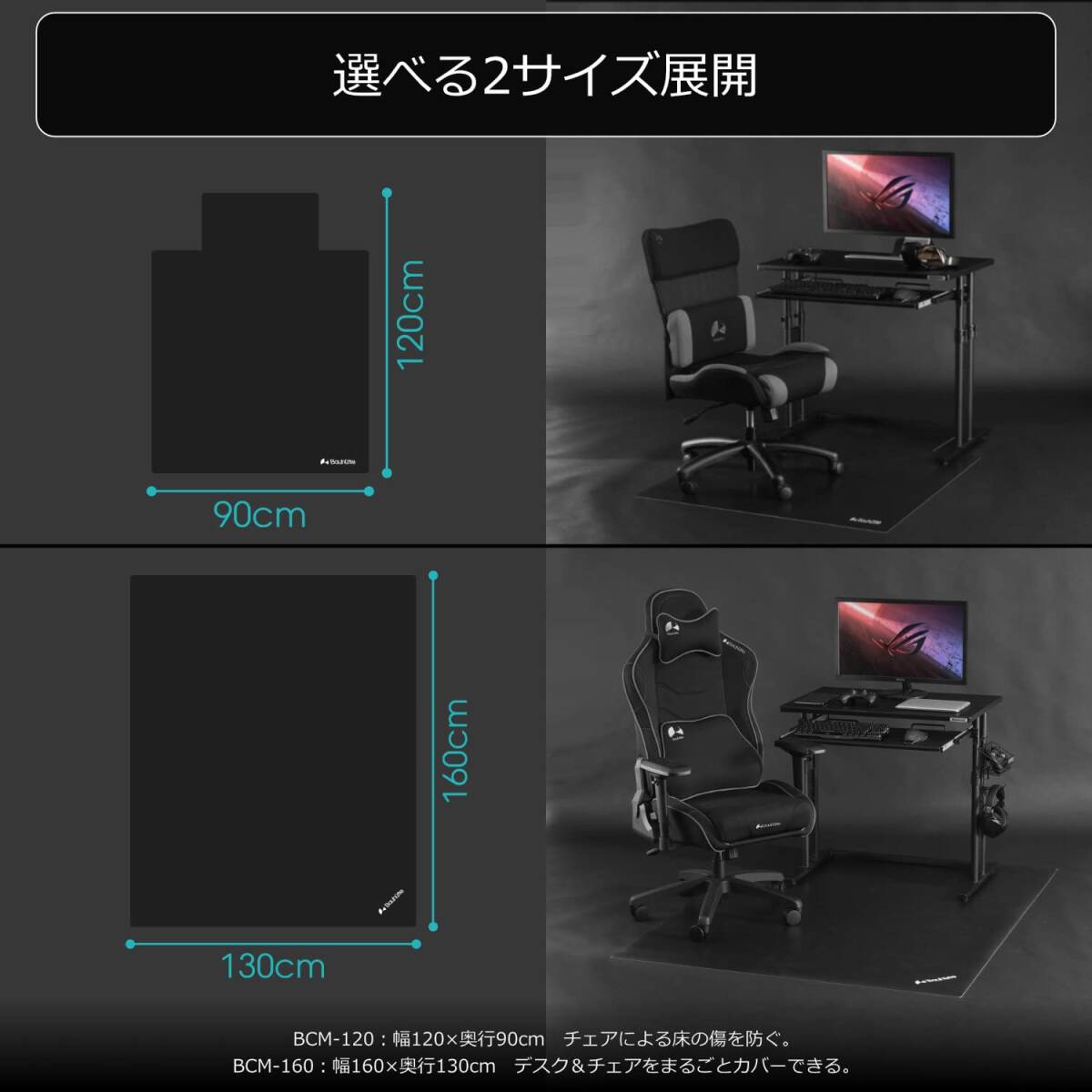説明 ◆デスクごとチェアマット 『机+椅子をフルカバーする大判チェアマット』 床をキズから守る、PVC素材のチェアマットです。 サイズの選べる3サイズ展開で、大判タイプはデスク脚部までカバーできます。 大型デスク環境にも対応床を傷から守る、ズレないマット 「足元のフローリングが傷だらけに! 」 「キャスター音が響くと階下の住人に怒られた! 」 そんなことにならないよう、キャスター付きのチェアを導入したら マットを敷いて床を保護しましょう。 サイズは全3種類で展開し、大型デスク&チェアをまるごとカバーする 超大判タイプもラインナップ。 自宅での本格的なデスク環境構築をサポートします。 裏面に滑り止め加工を施した、ズレにくく使いやすいチェアマットです。 ※クリアタイプには滑り止め加工なし。 ◆120サイズ(BCM-120) チェアのキャスターにより床が傷つくことを防ぐ。 サイズ:幅90×奥行120cm ◆160サイズ(BCM-160) デスクの接地面&チェアの可動域をまるごとカバー。 サイズ:幅130×奥行160cm ◆180サイズ(BCM-180) 大型デスクを用いた本格的なゲーム環境や、 複数の家具を配したレイアウトにも対応。 サイズ:幅160×奥行180cm