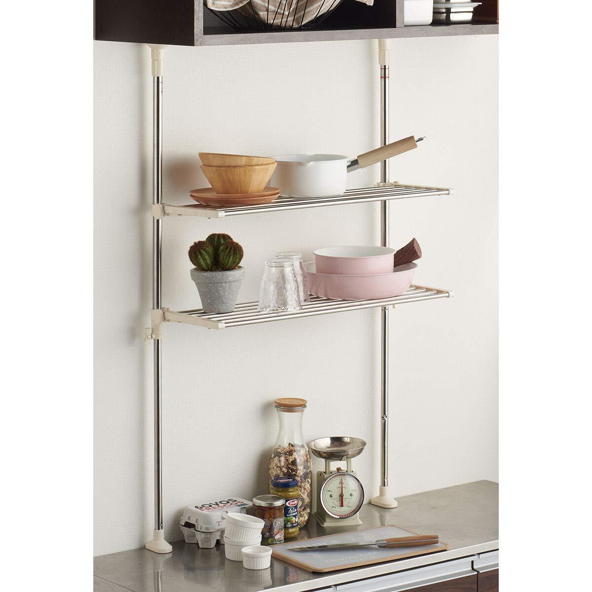 説明 ネジ・クギ不要でキッチンまわりや出窓に簡単に取り付け可能。キッチンまわりのスペースを有効活用できるつっぱりキッチンラック。 収納力抜群のパイプ棚2段式。(棚横幅60cm)。折りたたみ可能。 コンパクトで、一人暮らしに最適な大きさです。 ネジ・クギ・ドライバー不要でキッチンまわりや出窓に簡単に取り付けができるので、壁等を傷つけません。女性一人で簡単に組み立て可能です。 キッチンまわりやご自宅のシンク上でも使用可能、小物や調味料を効率よく収納します。