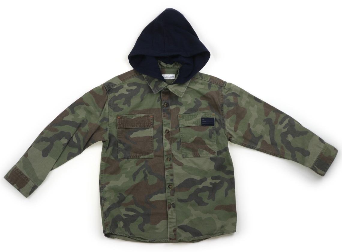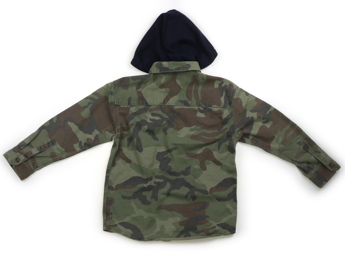 実際のサイズ表記は122cm。デニム生地。ボタン留め。フードの取り外しが可能です。全体に色褪せがあります。裾に反り返りがあります。やや使用感はありますが、まだまだ普段着として活躍してくれそうです。