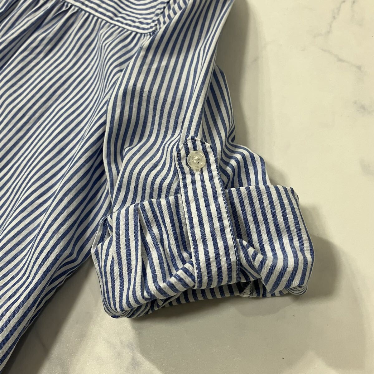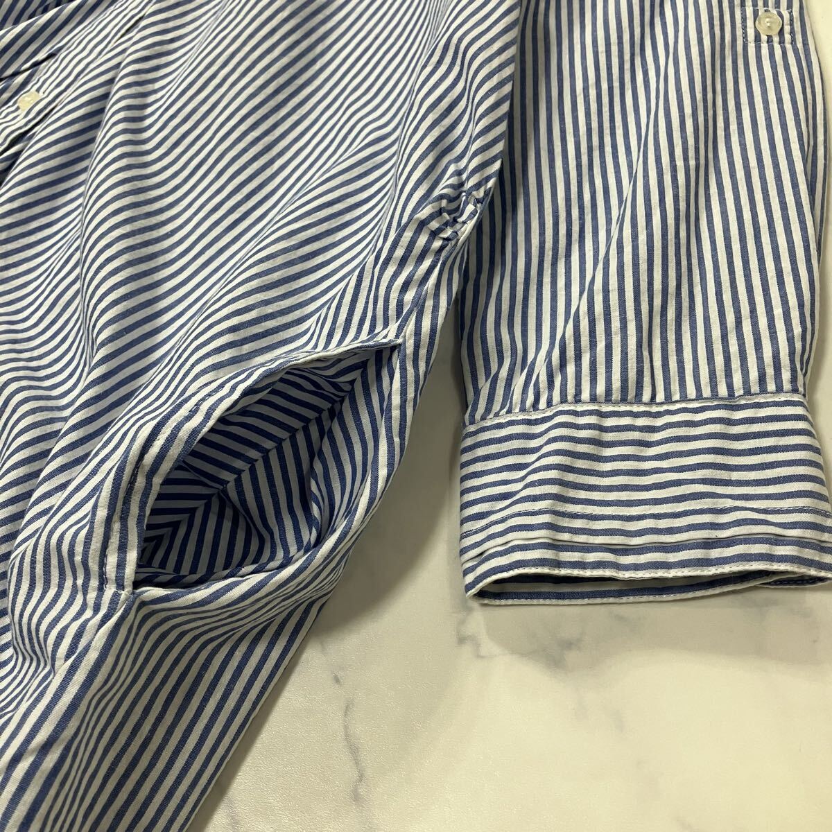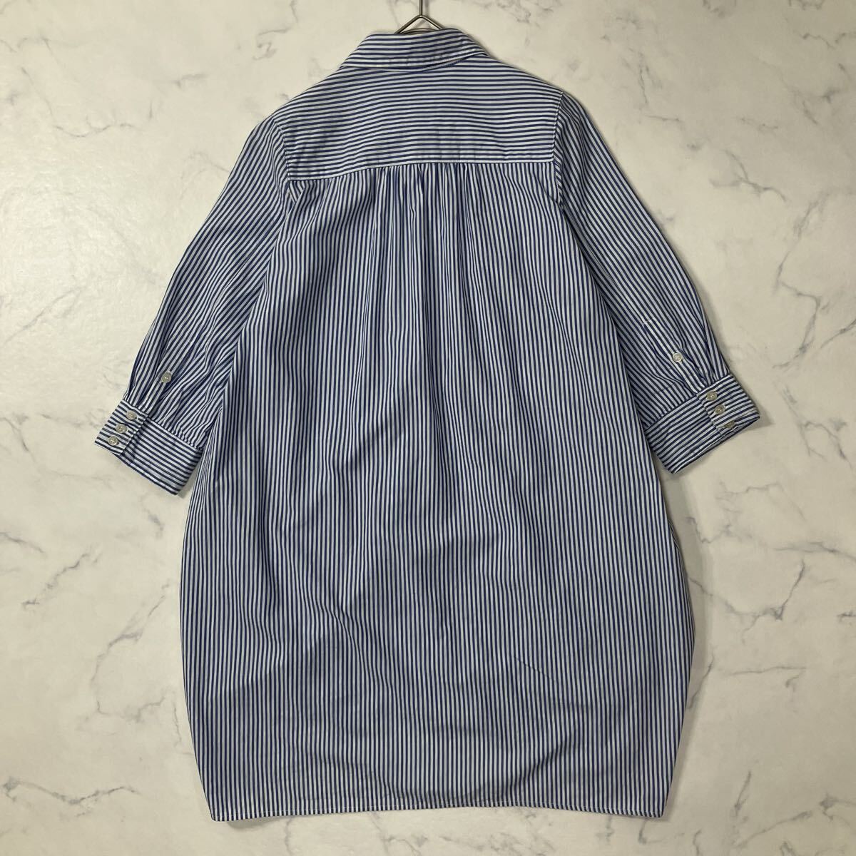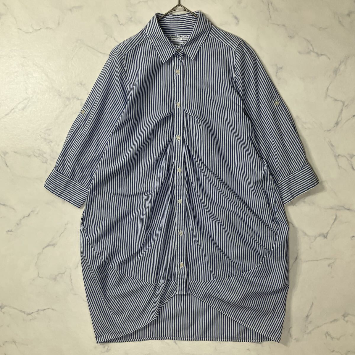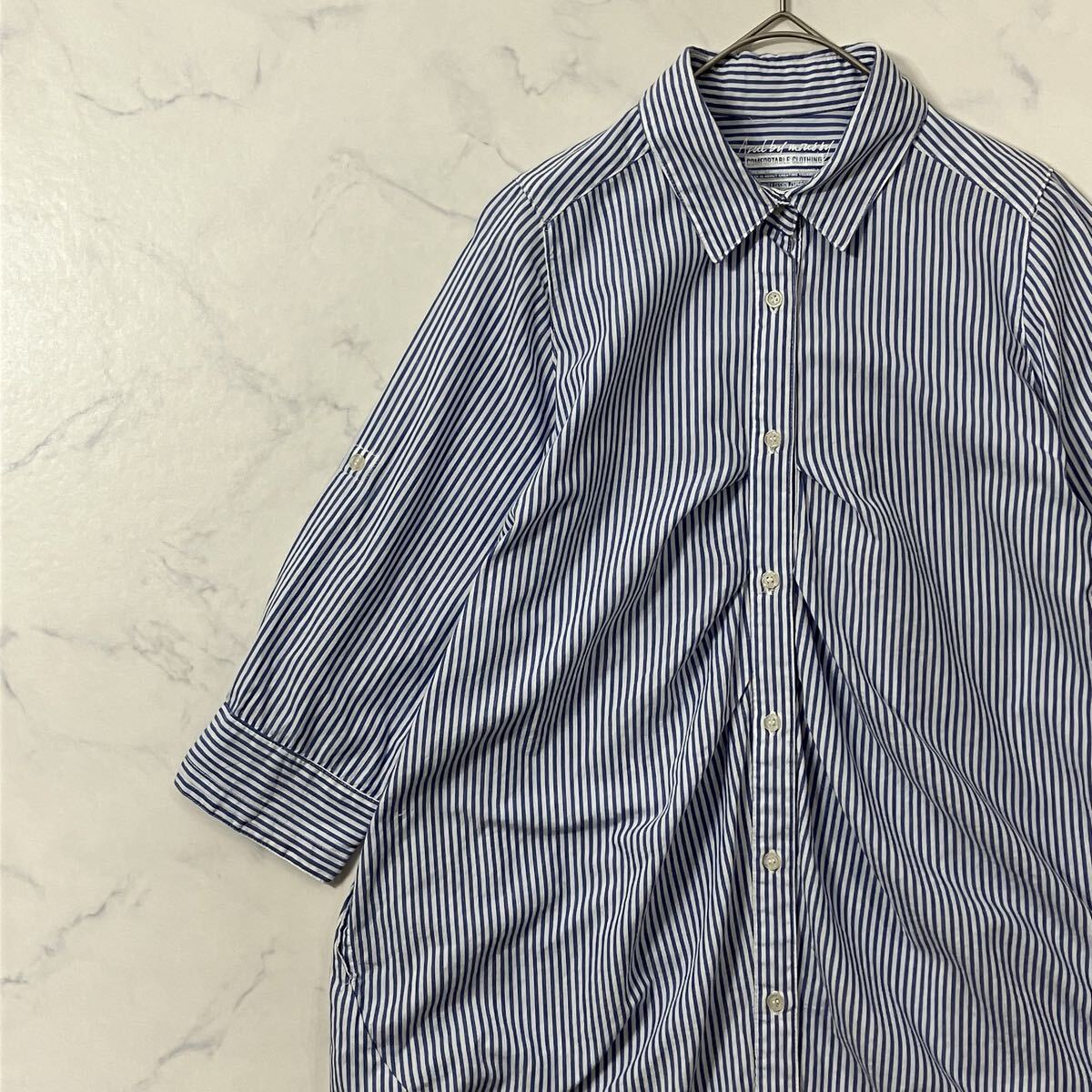 ストライプ 切替 ポケット タック ボタン デザイン性 フィッシュテール ロールアップ シャツカラー 七分袖 ロング シャツ ブラウス