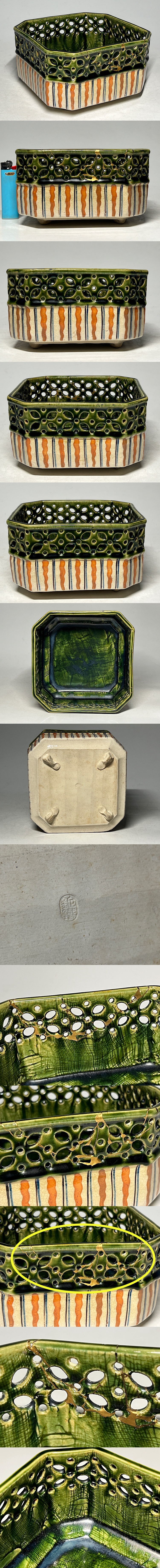 山口錠鐵 織部焼 透かし角鉢 *(直し有り) ◆商品詳細 寸法(約):9.3x15.7x14.7(高×幅×口径cm) ※寸法に若干の誤差が生じる場合もございます。 少し汚れ、縁に直しがありますので、 ご承知の上入札お願いします。 状態等画像にてご確認の上ご入札よろしくお願いいたします。 ◆発送先等のご連絡とお支払いについて ※発送先等のご連絡 落札時から48時間以内にお願い致します。 ※お支払 かんたん決済の期限内にお願い致します。 複数点落札時にまとめて取引の場合(72時間内)に、 まとめて取引の取引手順(落札者方の操作)を参考にお願い致します。 梱包したサイズを測って、地方によって送料を決めますので、よろしくお願いします。 ◆掲載画像について ※画像は現物を撮影しておりますが、照度、遮光、モニターによっては実物と 色目が異なって見えることがありますのでご注意ください。掲載画像では確認 できない傷や汚れがある可能性もございます、あくまで 中古品であるということをご承知の上、御入札をお願い致します。 ◆補償について 商品到着後はすぐに状態の確認をお願い致します。 商品の破損等がございまし たら、箱や梱包材など全てそのままの状態で保存し、お早めにご連絡ください。 (到着日から一週間以上経過、梱包材の廃棄済み等の場合、保証は致しかねます のでご注意ください。) ◆返品について 思っていたイメージと違う、などのお客様主観による返品はお受けできません ので、予めご了承ください。ノークレーム、ノーリターンでお願いします。届 いた商品が商品説明と著しく異なる場合(寸法、キズ記載ミスなど)のみ承り ます。早めにご連絡ください。 ◆注意事項 当方の希望価格と隔たりがある場合は、終了前にやむなく取下げさせて頂く場 合がございます。 ※商品ご落札翌日から4日間以内にご連絡が取れない場合は、入札取消の処置を 取らさせていただく場合がございます。 ※評価の悪い方は取り消す場合がございます。 ※原則として当方の不備以外のキャンセル・返品・返金は受け付けておりません。 以上の点を予めご了承頂いた上で、入札・落札お願い致します。 ◆発送方法 ▼ゆうパック(補償あり/追跡あり) 梱包後のサイズ:~約60cm ※送料全国一律880円 (但し北海道、沖縄、離島は+500円いただきます。) 発送元は静岡県となります。 ( 商品の組み合わせによっては同梱をお断りさせていただく場合があります。) ※大型商品について 郵便局の規定を超える商品の場合は、佐川急便またはヤマトでの発送となります。 |