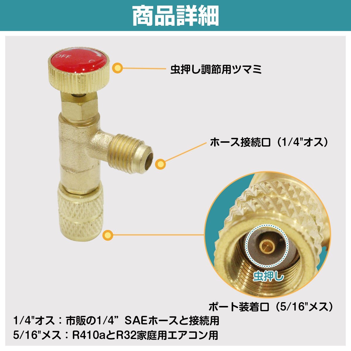 エアコン ガス チャージ バルブ R410a R32 オス 1/4 メス 5/16 コントロール バルブ ホース 冷媒 ゲージ 真空引き 真鍮 制御