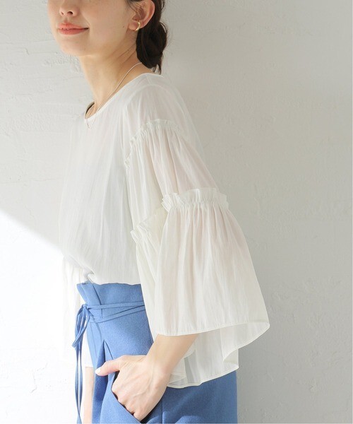 フリルディティールでも甘すぎず、ラフに着れるT-ブラウス。ヨコ糸の割繊が通常のフィラメントカウントよりも多いものを使用し、さらに糸が複数に割れることで更なる柔らかさを表現した素材感が特徴。女性らしい落ち感があり、甘すぎずさらりとしたタッチの軽やかな肌触りが魅力です。 カジュアルなデニムパンツにもレディなスカートにも合わせやすく、様々なスタイリングが楽しめるアイテムです。