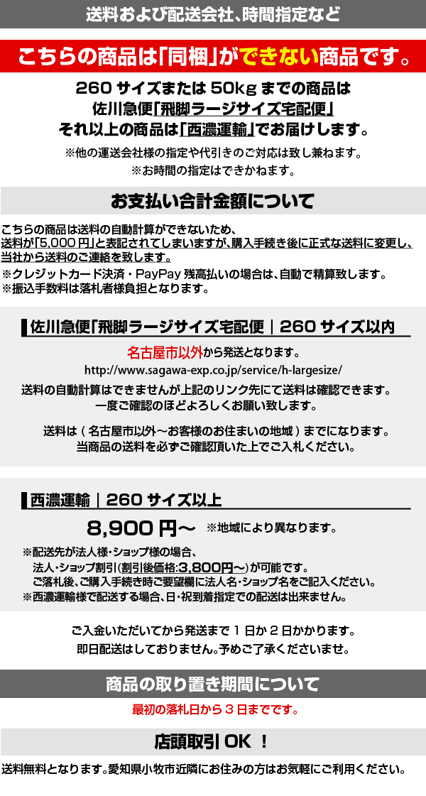 購入手続き時に送料5,000円と表示された場合は、ご落札後当社から正しい送料をご連絡いたします。