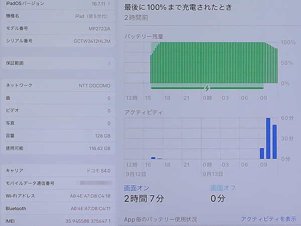 | ◆ 第5世代iPad 128GB (MP272J/A) softbankモデル(SIMロック解除品)です。 ◆ 液晶はほぼ無傷ですが、ガラス内側に小さな(汚れ?)のようなものがございます。 外装の所々に小傷はございますが、破損や目立つ傷はございません。 ◆ 内蔵電池はフル充電後、明るさ50%、音量50%で約2時間7分youtube再生後、残量は85%でした。 ※バッテリーは使用環境等により、当方の動作確認状態と異なる場合がございます。あくまでも目安としてお考え下さい。 ◆ 下記の動作を確認しています。 ※SIMの動作はOCNモバイル(docomo系)を使用しています。