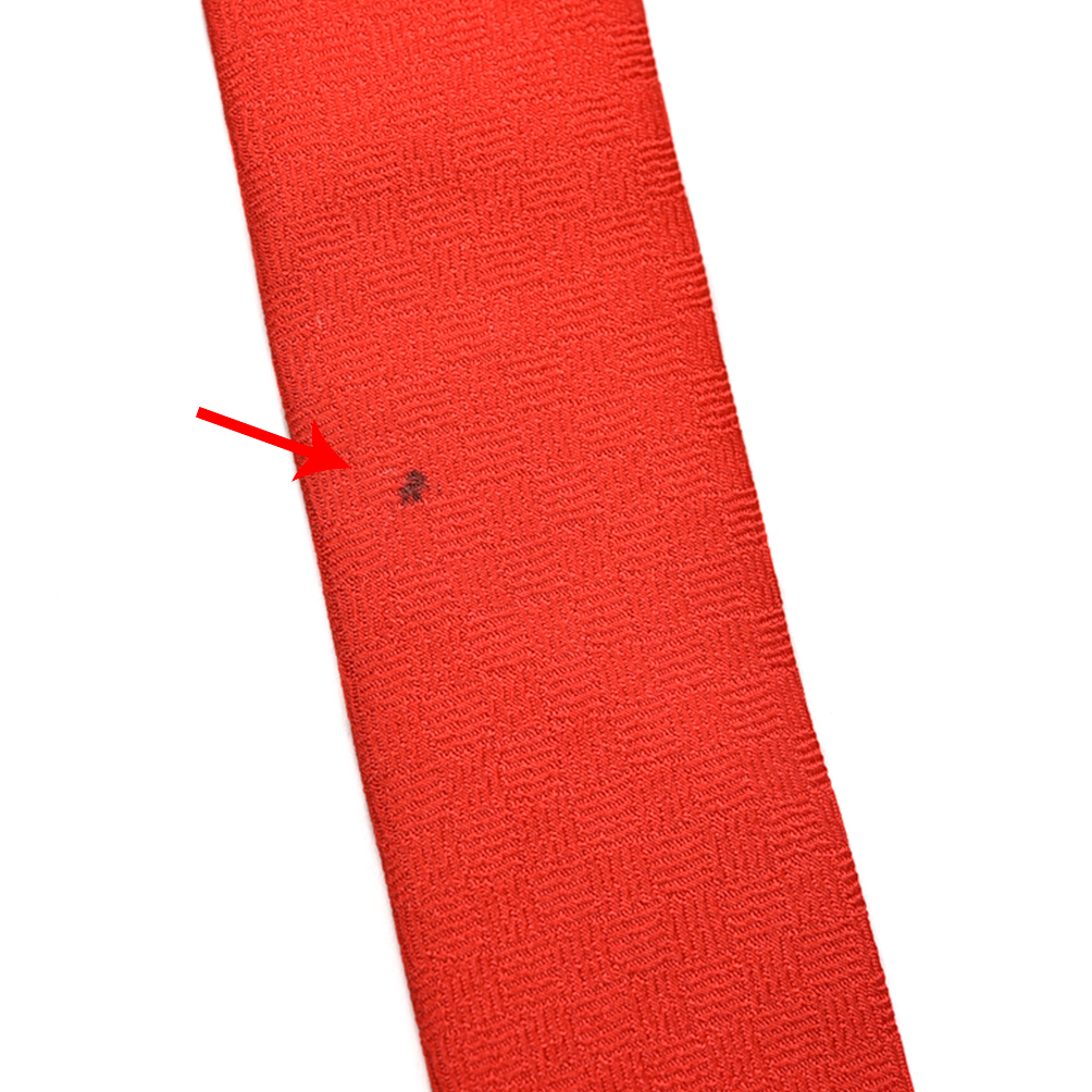 | ネクタイ表側、小剣先より35.5cm付近に黒いシミがございます。またネクタイ裏側、大剣先より70cm付近に生地不良がございます。詳細は画像にてご確認ください。 | |