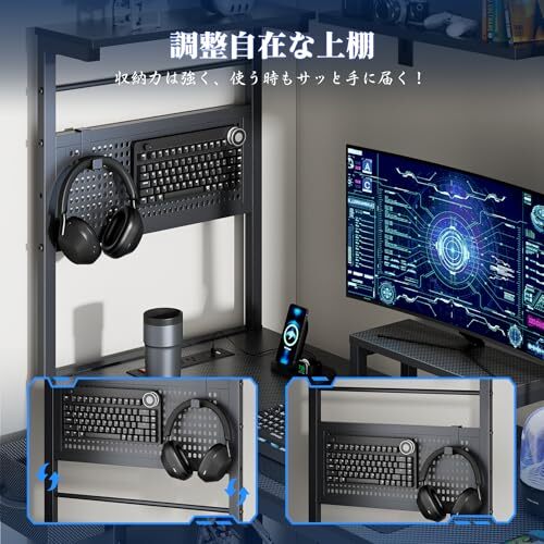 【昇降棚付き・DIY性満載のデスク】昇降可能な棚設計と、自由に組み立て可能な有孔ボードで、優れた収納力を発揮しながら、お好みに合わせてインテリアをカスタマイズできます。フックと収納ボックスも備えており、筆記用具やヘッドホンなど、必要な時にすぐに取り出せます。ゲーミングデスクやオフィスデスクとしても、十分なスペースを確保しています。