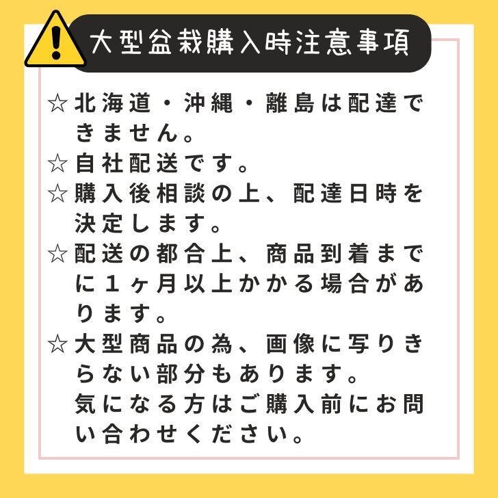 | 大型盆栽・自社配送商品です。 ※画像に写りきらない部分もあります。 ※気になる方はご購入前にお問い合わせください。 |