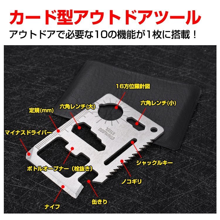 ・カード型アウトドアツール[缶きり、ナイフ、ドライバー、定規(mm)、ノコギリ、ボトルオープナー(栓抜き)、六角レンチ(小)、六角レンチ(大)、シャックルキー、16方位羅針図]
