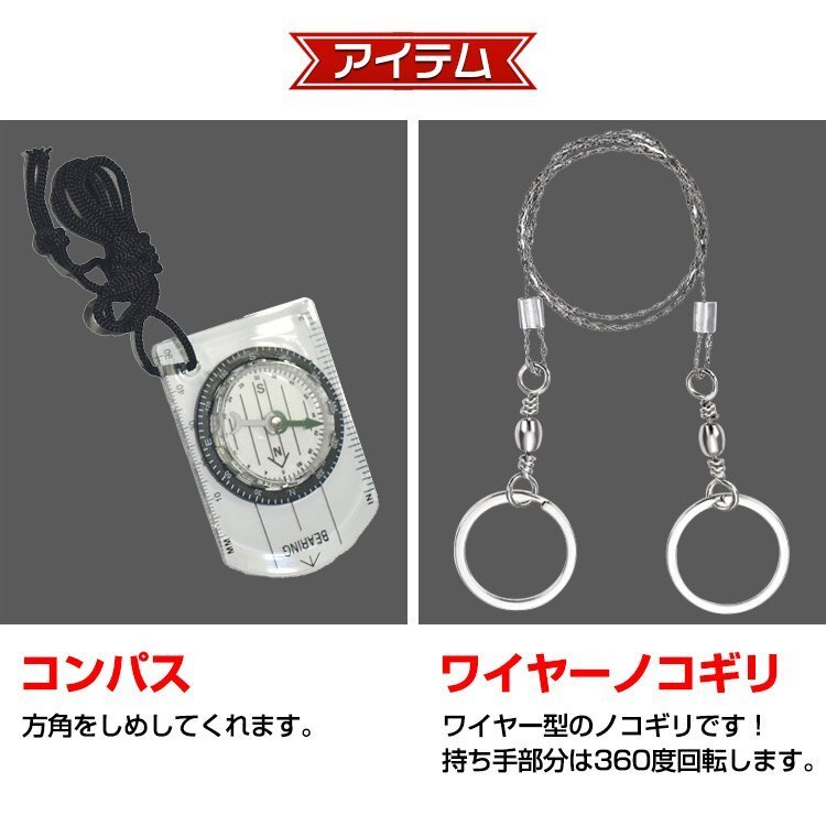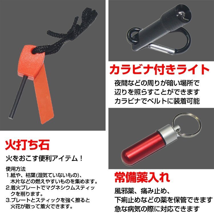 ■ワイヤー型ノコギリをはじめ、ライトやドライバー、火打石など、緊急時に役立つアイテムが盛りだくさん!