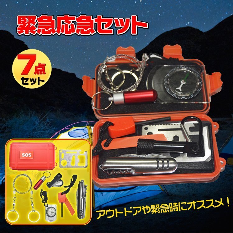送料無料 サバイバル ツール 7点セット アウトドア キャンプ 登山 笛 方位磁石 ワイヤー のこぎり ナイフ マルチ カード 火打ち石 od407