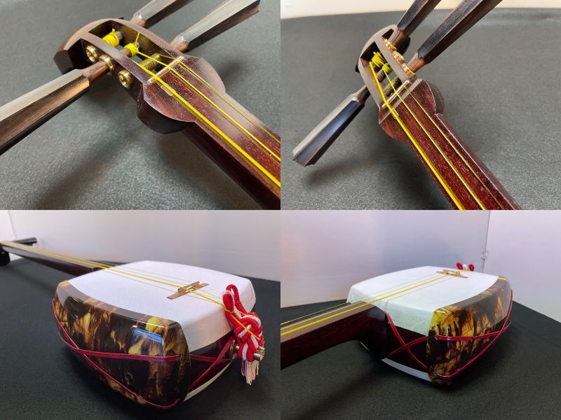 棹は地唄用で少々太目で、棹と胴にりんどう金具仕込みです。