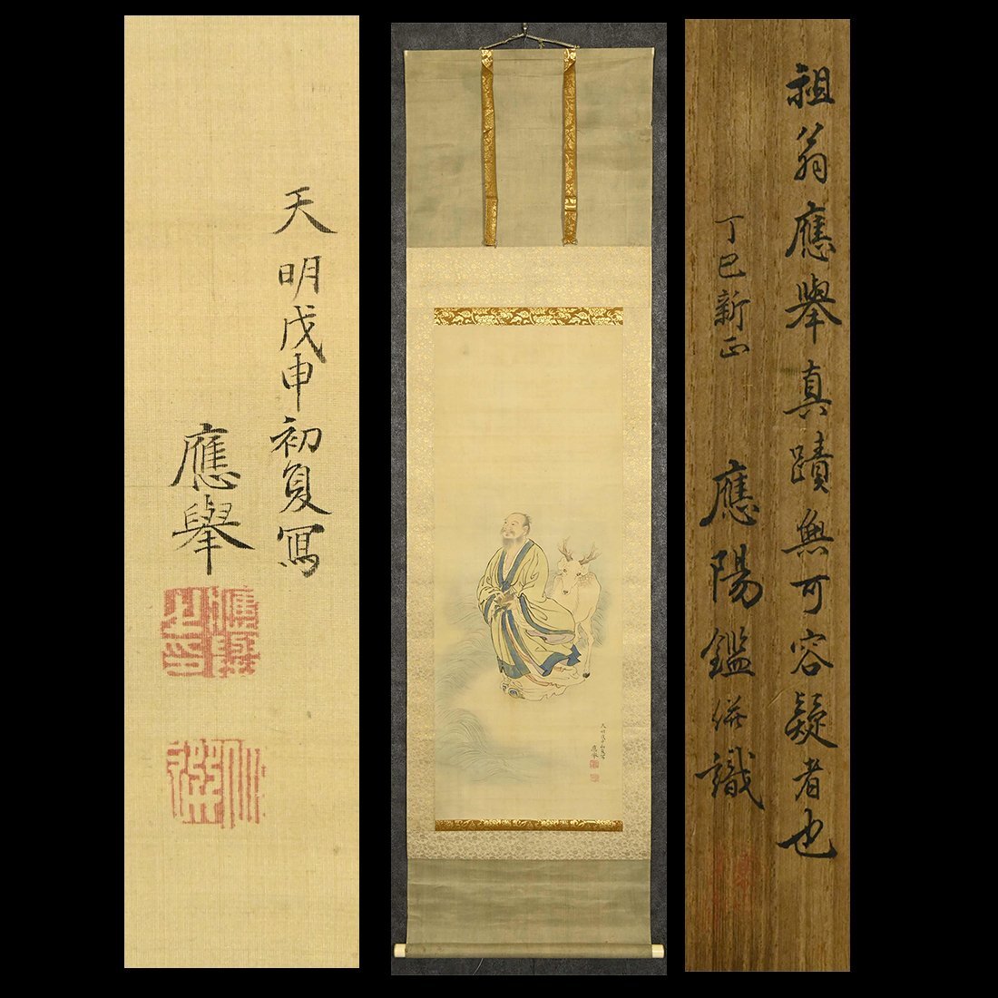 【永】b130【兵庫県の図書館や博物館の館長を歴任された歴史研究家遺族委託品】掛軸 円山応挙 鹿人物図幅鑑定有 人物画花鳥画日本画古画