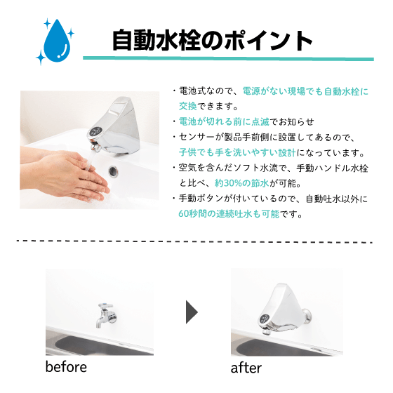 ・ 水栓に直接触れないで手を洗うことができるため衛生的で、また感染症予防にも効果的です。