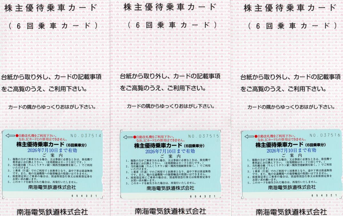 クリポ無料 南海電気鉄道 株主優待乗車カード18回分(6回分×3枚) 有効期限2026/7/10まで