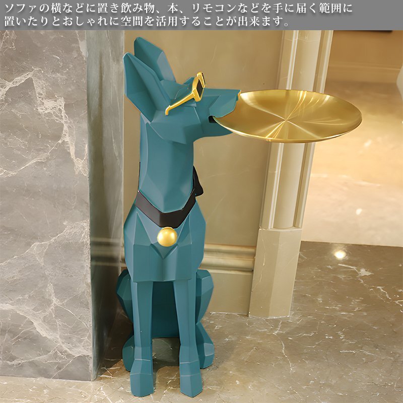 ![]() 珍しいオブジェ風のサイドテーブルです。 犬がトレーを咥えているようなデザインのサイドテーブルは、ユニークで魅力的なアクセントアイテムです。 まるで忠実な仲間がトレーを持っているかのような姿勢が、心温まる感覚を呼び起こします。 トレーを咥えているところがワンポイントで可愛いです。 犬の愛らしいフォルムが、インテリアに温かみと楽しさをもたらします。 ソファの横などに置き飲み物、本、リモコンなどを手に届く範囲に置いたりとおしゃれに空間を活用することが出来ます。 耐久性のある素材で制作されており、長い間お部屋の一部として楽しむことができます。 また、親しい方へのギフトとしても喜ばれることでしょう。 トレーは取り外し可能となっております。 届いてスグに使えるカンタン組立 天板を犬の口に咥えさせるだけ! 複雑な作業は必要ないので、慣れてない方でもカンタンに組み立てることが出来ます。 ティファニーブルー風のお色になります。 サイズ(約):縦72cm、横20cm、奥行き26cm トレーサイズ(約):横26cm、奥行21cm カラー:ティファニーブルー風×ゴールド 素材 本体:プラスチック トレー:ステンレス 重量(約):3.6kg ※この商品はお客様の方で簡単な組み立てが必要になります。 |