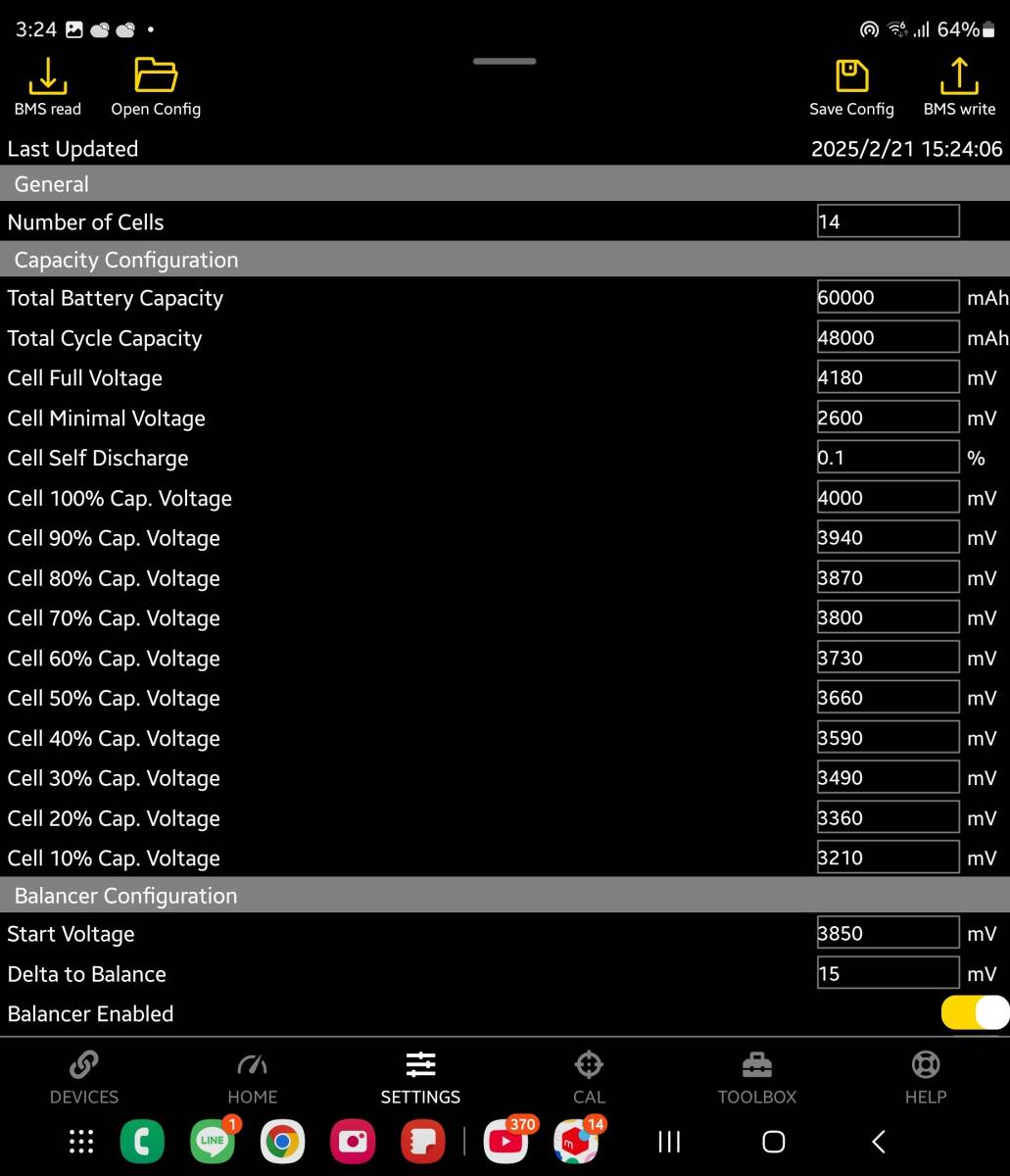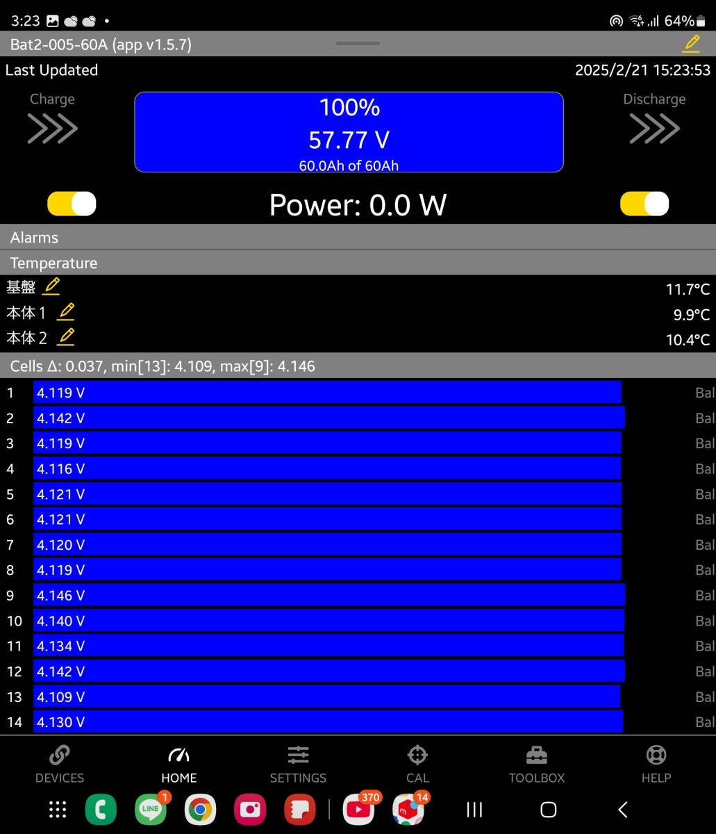 不具合があった時は出力はカットされ、スマホで原因を確認ができ、各セルの電圧、セルの最高電圧、最低電圧、気温による放電電圧、充電電圧も設定出来ます。