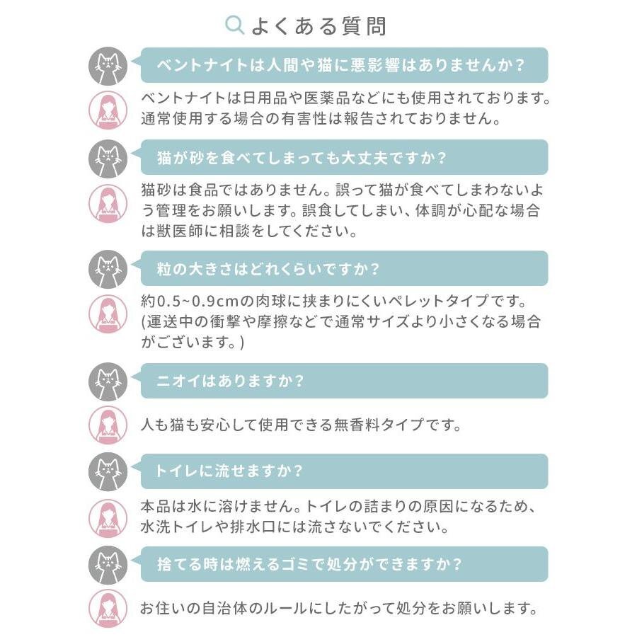 【注意事項】 ・トイレに流せる タイプではありません、水に溶けません。 トイレの詰まりの原因になるため、水洗トイレや排水口には流さないでください。 ・乳幼児やペットが触れない所に保管してください。 ・開封後は袋の口をしっかりと閉じ、湿気の少ない乾燥した場所に保管してください。 特に梅雨時期などには吸水、固化性能に影響を与える場合があるため、ご注意ください。 ・砂の固まり具合は、猫の尿量や体調、季節の影響により変化することがあります。 |