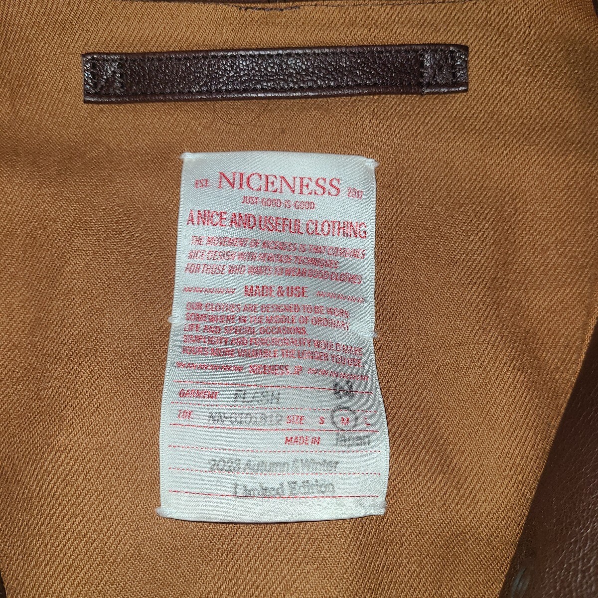 NICENESSの"FLASH"はUSAFジャケットとアヴィエータージャケットがベースとなり、今季好評のエジプトでしか取れない希少なバッファロー原皮を纏っている。タンニンしされたこの革の魅力は絶妙なしなやかさとコシ、耐久性も抜群で着込むことでさらに味わい深い表情になるだろう。アメリカ映画の俳優が着ていそうな男らしさ満載なレザーをどう自分色に染め上げ、どう現代的に落とし込むか。レザ一JKTの醍醐味が詰まってる。
