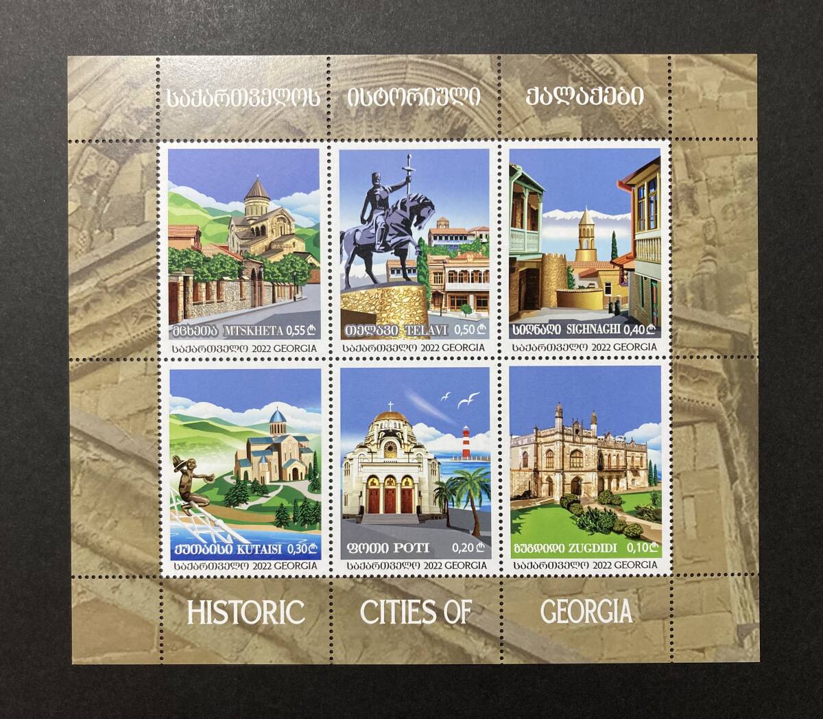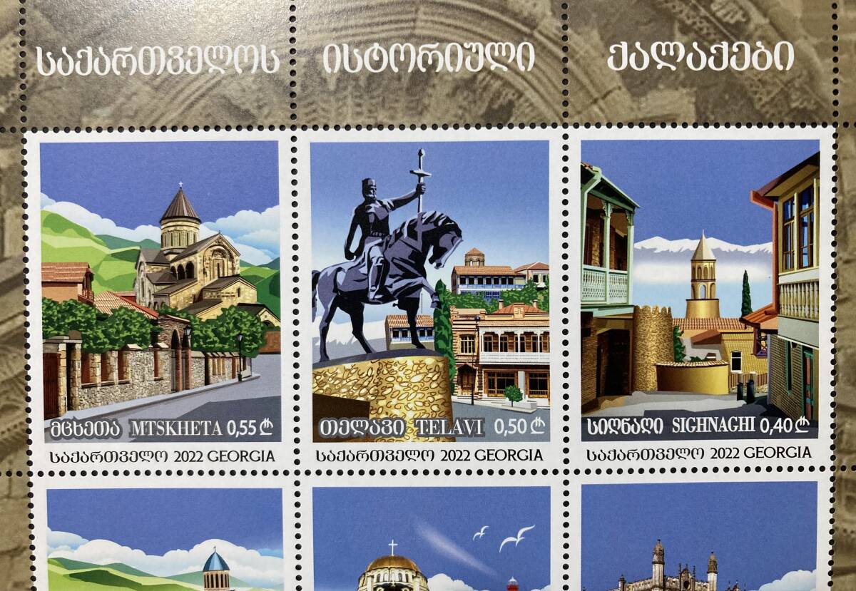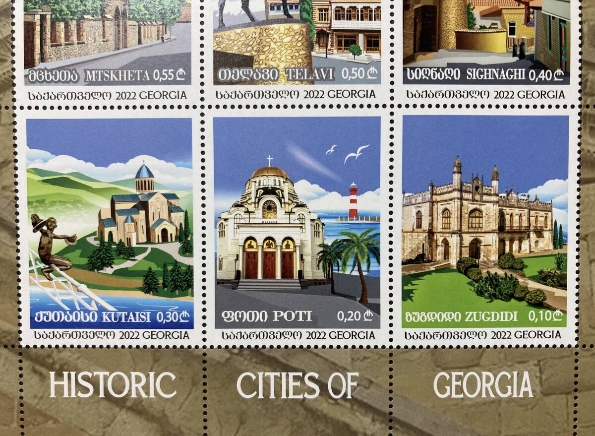 ●図案等:ジョージアの歴史的都市 6種小型シート - ムツヘタ(スヴェティツホヴェリ大聖堂)、テラヴィ、シグナギ、クタイシ(バグラティ大聖堂)、ポティ、ズグジジ(ダディアニ宮殿)。