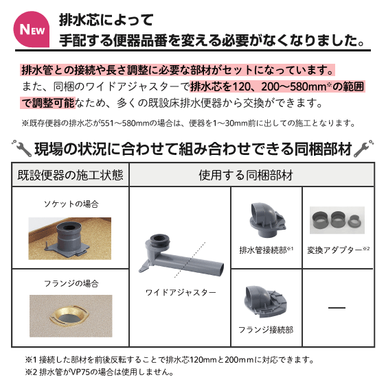 ・ ワイドアジャスター搭載で、市場のほとんどの便器から交換可能です。