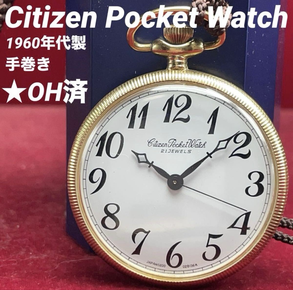 ●1960年代製のCITIZEN ポケットウォッチ(懐中時計)です。12時下にある筆記体の"Citizen Pocket Watch 21JEWELS"がモダンな印象を与えています。