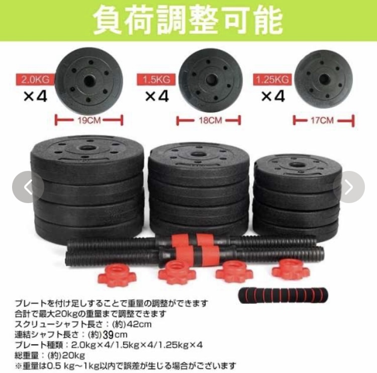 数ある中からご覧いただき、ありがとうございます(^^) カラー★レッド★ ※連結シャフト付きなので、2個の ダンベル を連結することで バーベル での トレーニング も可能です! ※コメント無しでの購入歓迎 ※沖縄・北海道の発送は3000円追加の送料必要なので購入前にコメント下さい。離島へは発送出来ません。 ※土日祝日発送はお休みです。 【商品説明】 ★10㎏×2個セット 合計20㎏★ 可変式 の ダンベルセット ご自身の 筋力 に合わせて ウェイト を 調整 できます。 初心者、エクササイズ から 本格的な 筋トレ まで対応。 ◆ プレート を付け足しすることで 重量 の 調整 ができます ◆日本人 に合った 25ミリ の グリップ ◆ゆるみを 軽減 するスクリューシャフト&カラー ◆2つの ダンベル を 接続 することで バーベル での トレーニング も可能! 【商品仕様】 《仕様・機能》ダンベル バーベル 10kg 2個セット 可変式 バーベル可変 可変スピンロック式 プレート セット 重さ調整可能 【商品内容】:ダンベルセット 【シャフト長さ】:(約)42cm 【プレート種類】:2.0kg×4/1.5kg×4/1.25kg×4 【総重量】:(約)20kg 《用途》筋トレ トレーニング 初心者 上級者 鉄アレイ グッズ 筋トレ器具 用品 両手 両腕 自宅 シェイプアップ ダンベルベンチプレス 筋力 ダイエット エクササイズ 男性 女性 ※商品は新品未使用品ですが、海外製につき国産メーカーと違い、細かな傷、汚れ等がある場合がございますので安目の金額に設定しております。 また梱包段ボールが破損していていることがございます。 使用に際して何ら問題はございませんが、 神経質な方や、完璧な品を求めてる方は購入をお控え下さい。 ※重りを止めるカラーは、赤又は黒で色はランダムです。 筋トレ トレーニング 初心者 上級者 鉄アレイ 筋トレ器具 両腕 シェイプアップ ダンベルベンチプレス 筋力 ダイエット エクササイズ
