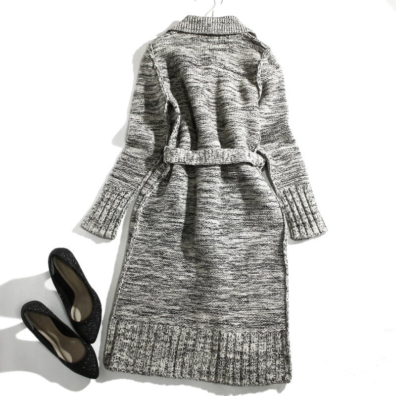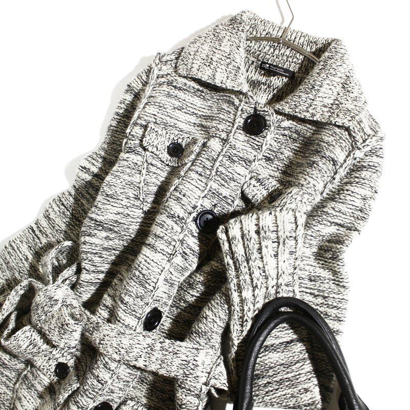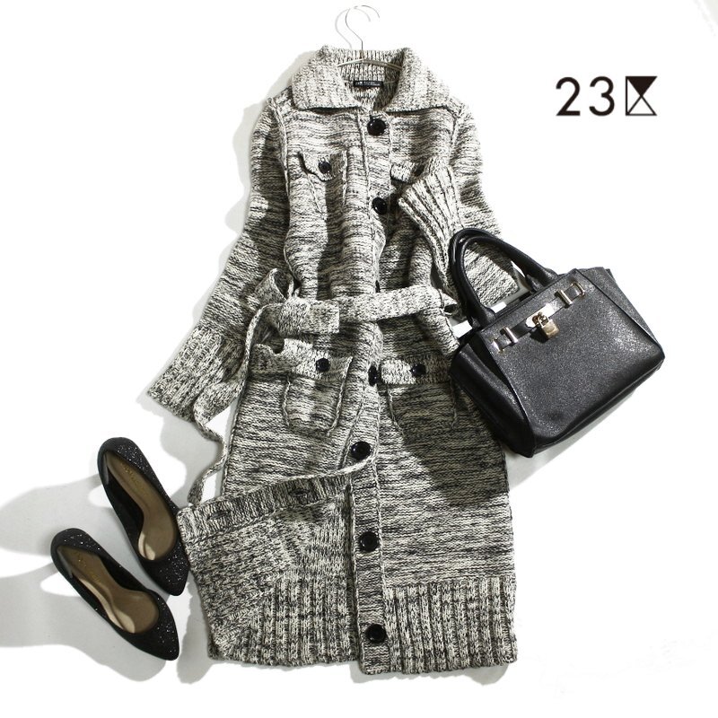 23区のロングニットコートです。 ブラックとホワイトのミックス糸で編まれた表情豊かなニット素材が特徴です。 細身シルエットで、ガウンのようにベルトでウエストマークして着こなしていただけます。 ウールの暖かみのある素材で、これからの季節に活躍します。