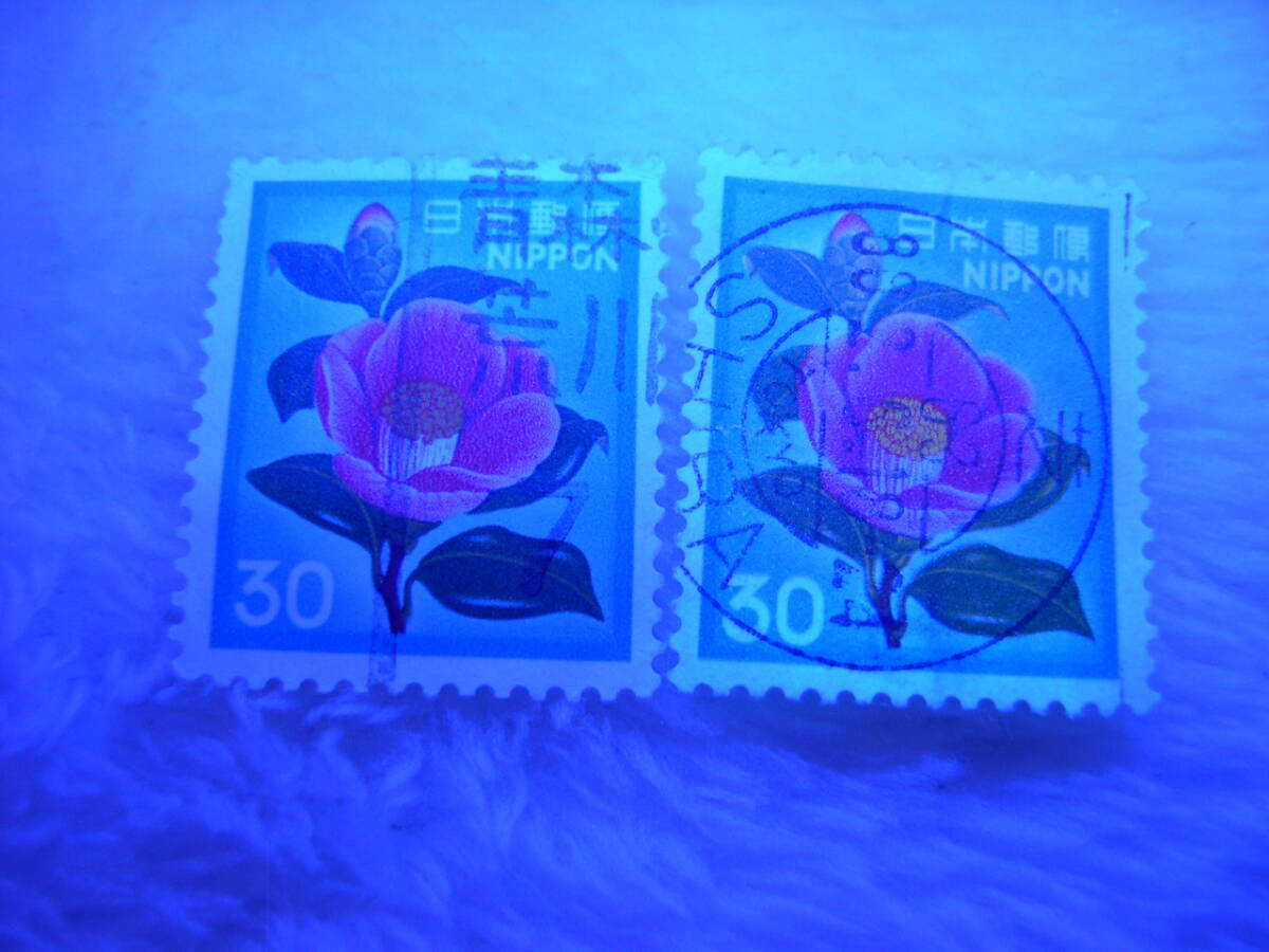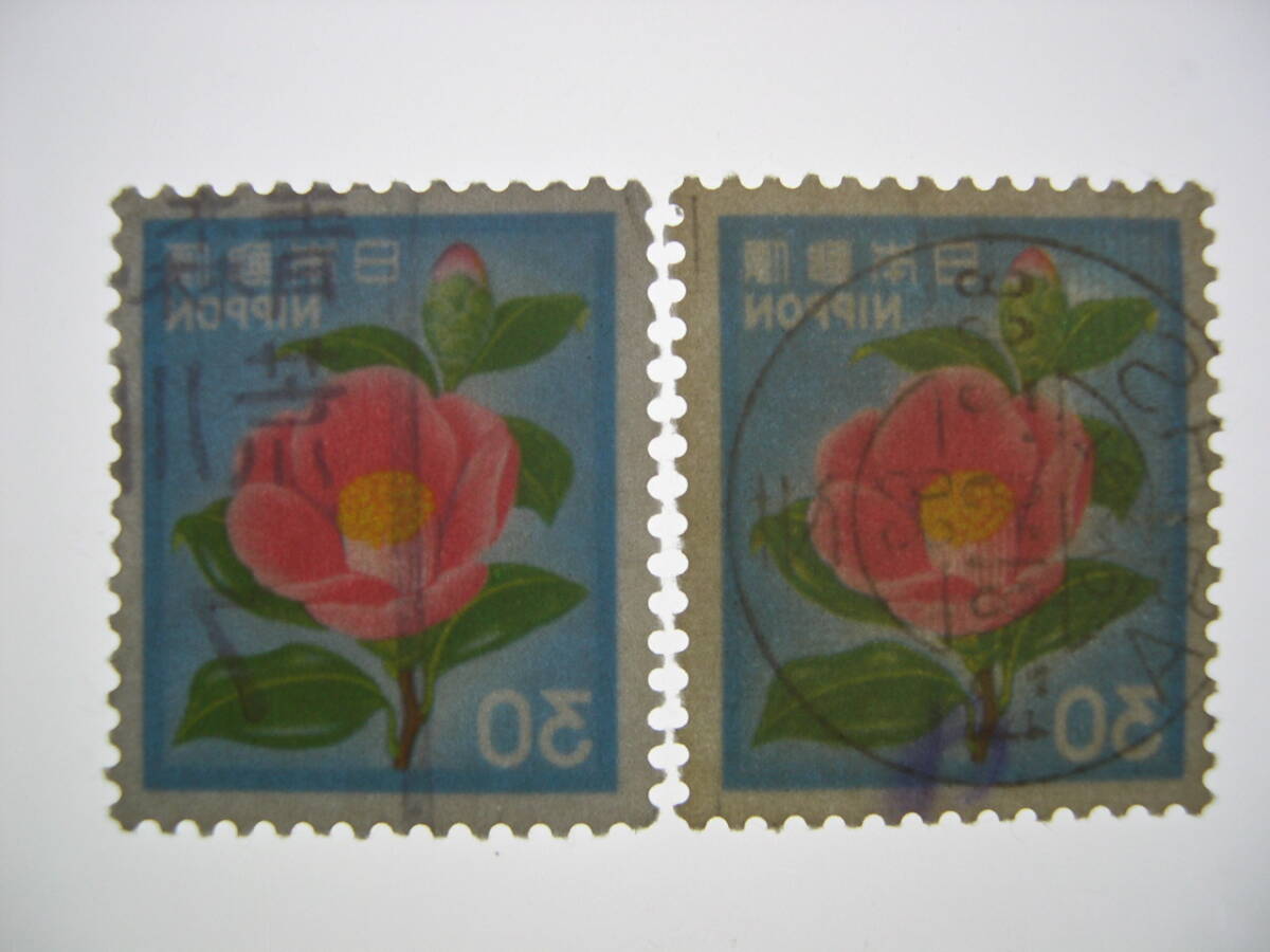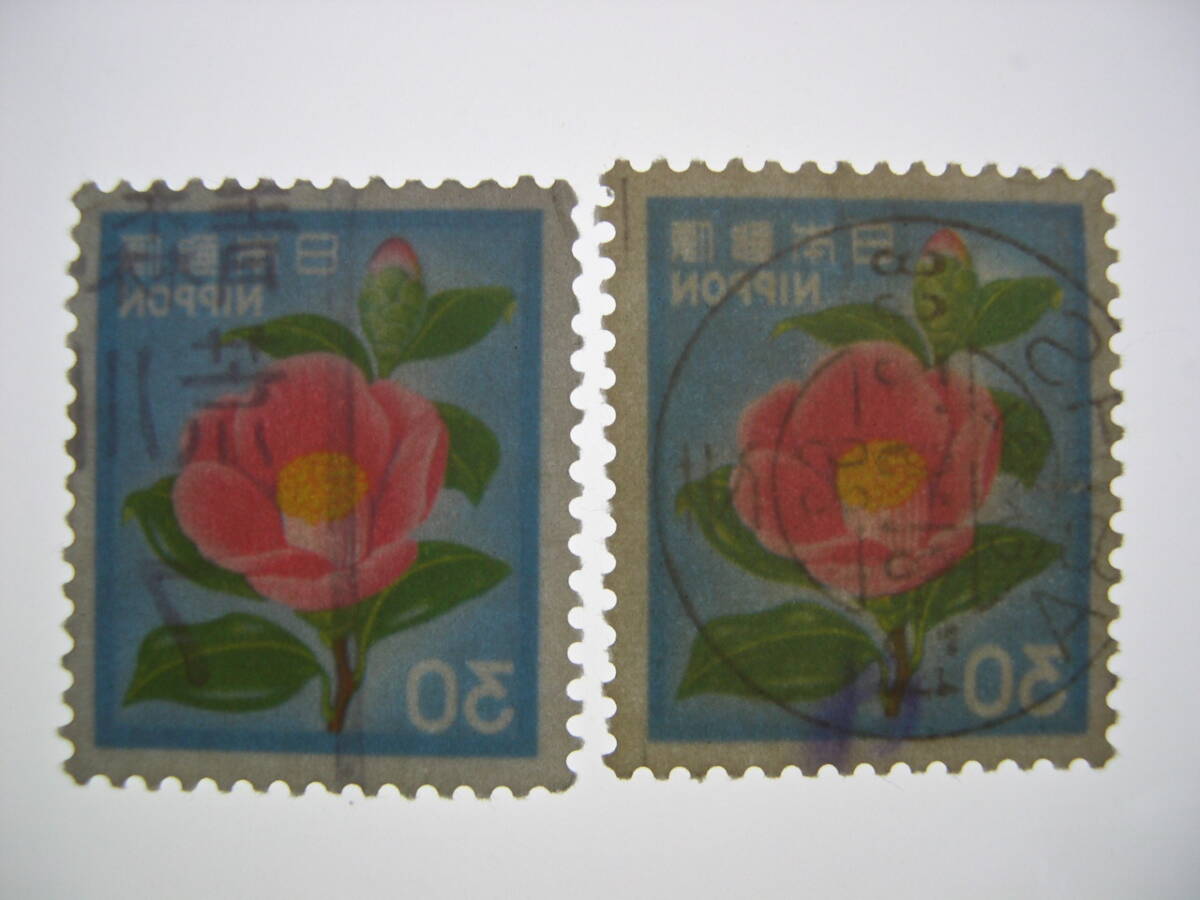1980年シリーズ花・貝・文化財・30円ツバキ切手普通インク印刷と発光インク印刷の使用済み2枚セットです。