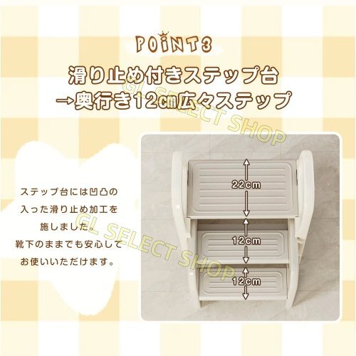 • 【滑り止め付きステップ台→奥行き12㎝広々ステップ】ステップ台には凹凸の入った滑り止め加工を施しました。靴下のままでも安心してお使いいただけます。