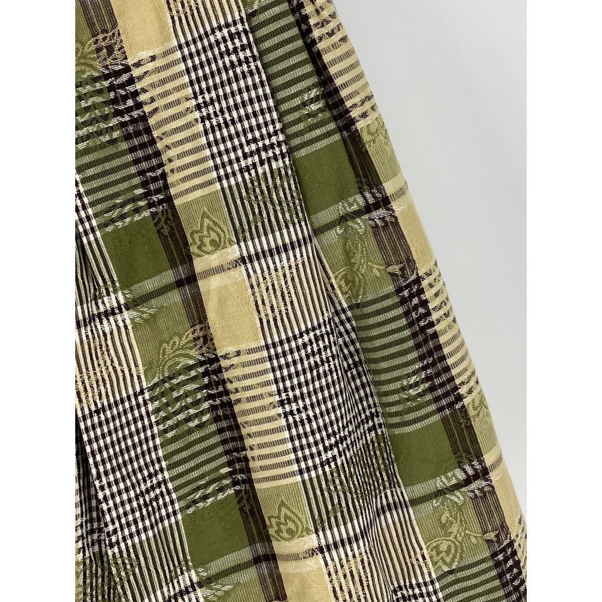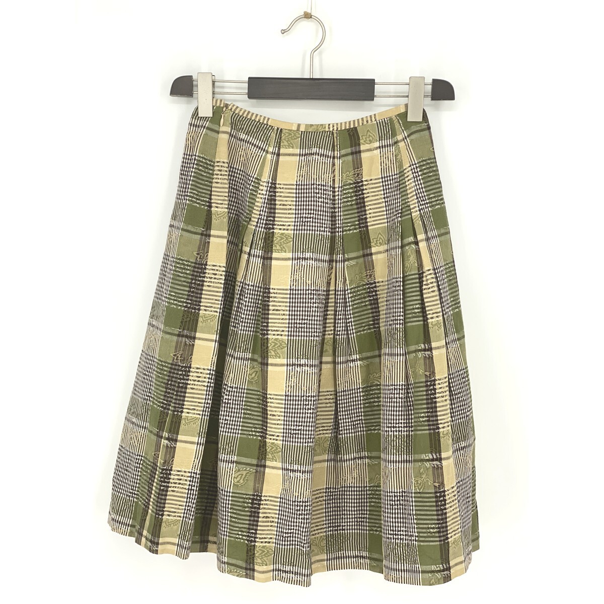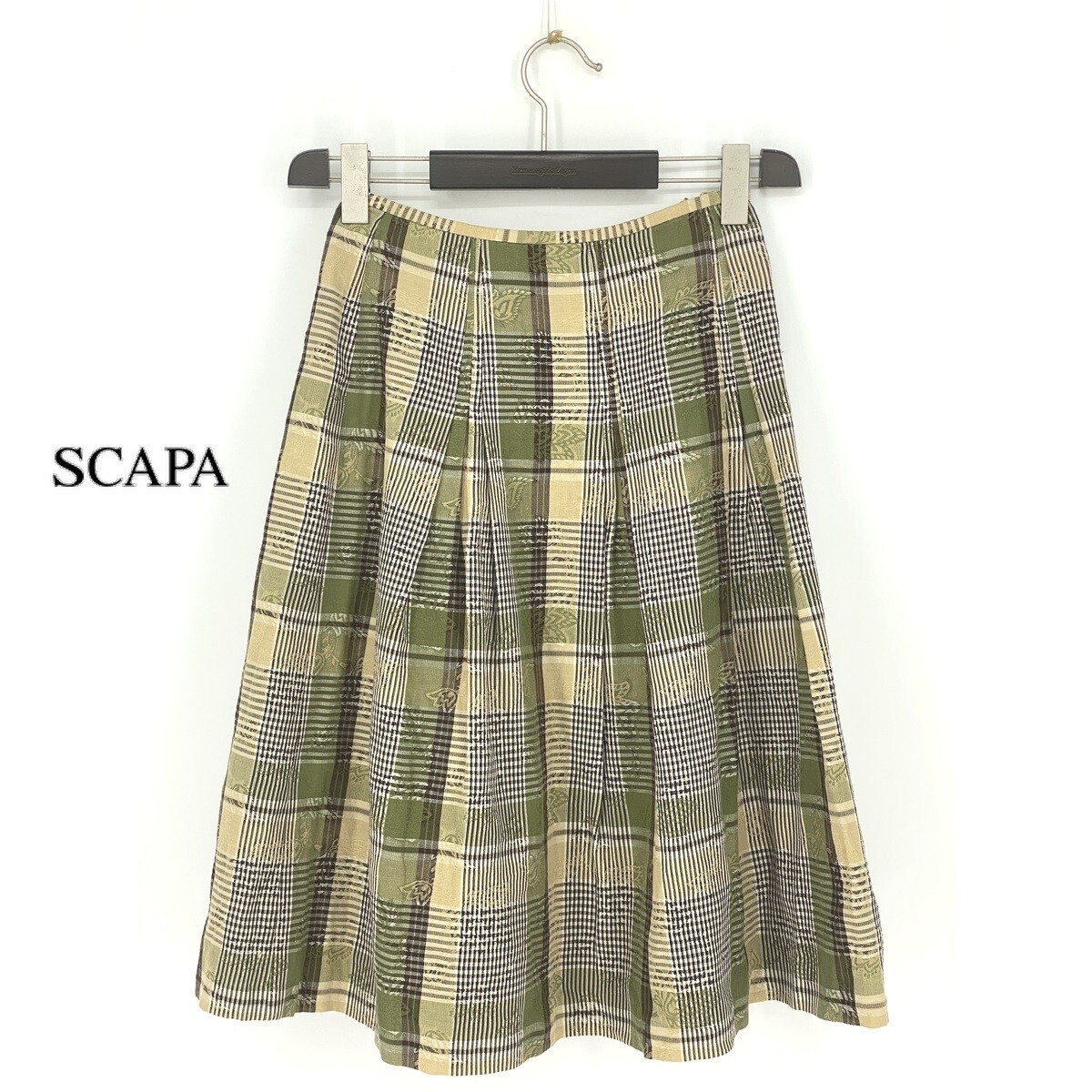 B0401/極美品 SCAPA スキャパ リネン コットン チェック 花柄 総柄 刺繍 プリーツ フレア ロング ミモレ丈 スカート 36 S程 緑 レディース
