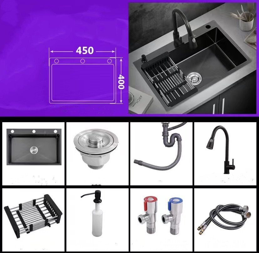 付属品:流し台、排水器、蛇口、排水ホース、バスケット、ソープデイスペンサー、冷熱管、アングルバルブ