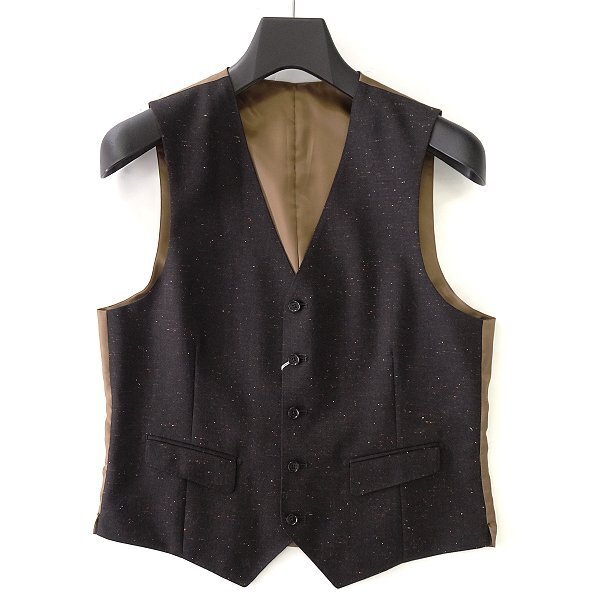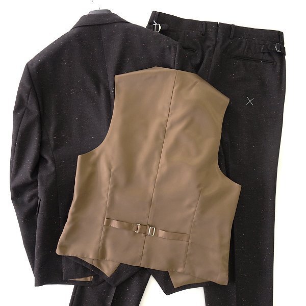| 新品 未使用 紙タグあり A6サイズ(普通体型のLサイズ相当) 胸囲94 胴囲82 身長175 ※商品に記載されたサイズ・寸法です※ 【ジャケット】 肩幅43.5cm 身幅51cm 袖丈61cm 着丈69.5cm 【ベスト】 身幅49cm 着丈55.5cm 【スラックス】 ウエスト84cm(内回り1周) 股上25.5cm 股下92cm 裾幅18cm 腿幅28.5cm(股下10cm部分) 表地:毛51% ポリエステル45% レーヨン4% 胴裏:ポリエステル100% 袖裏:キュプラ100% ベスト表地前身頃:毛51% ポリエステル45% レーヨン4% ベスト表地後身頃:ポリエステル100% ベスト裏地:ポリエステル100% 下衣裏地:ポリエステル100% ブラウン |