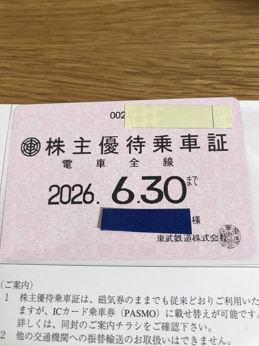 東武鉄道の株主優待乗車証(定期券)です。 2026年6月末まで有効です。 送料込みです。