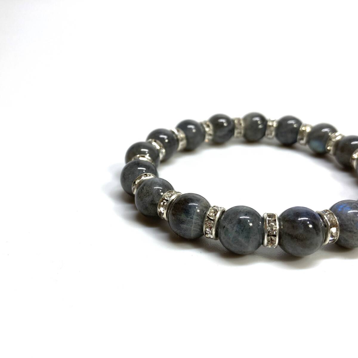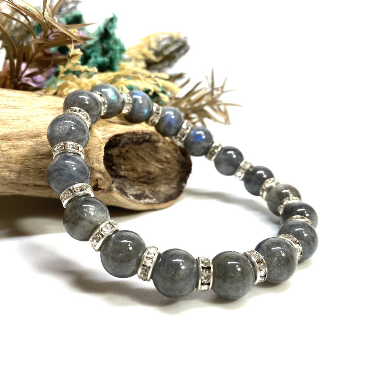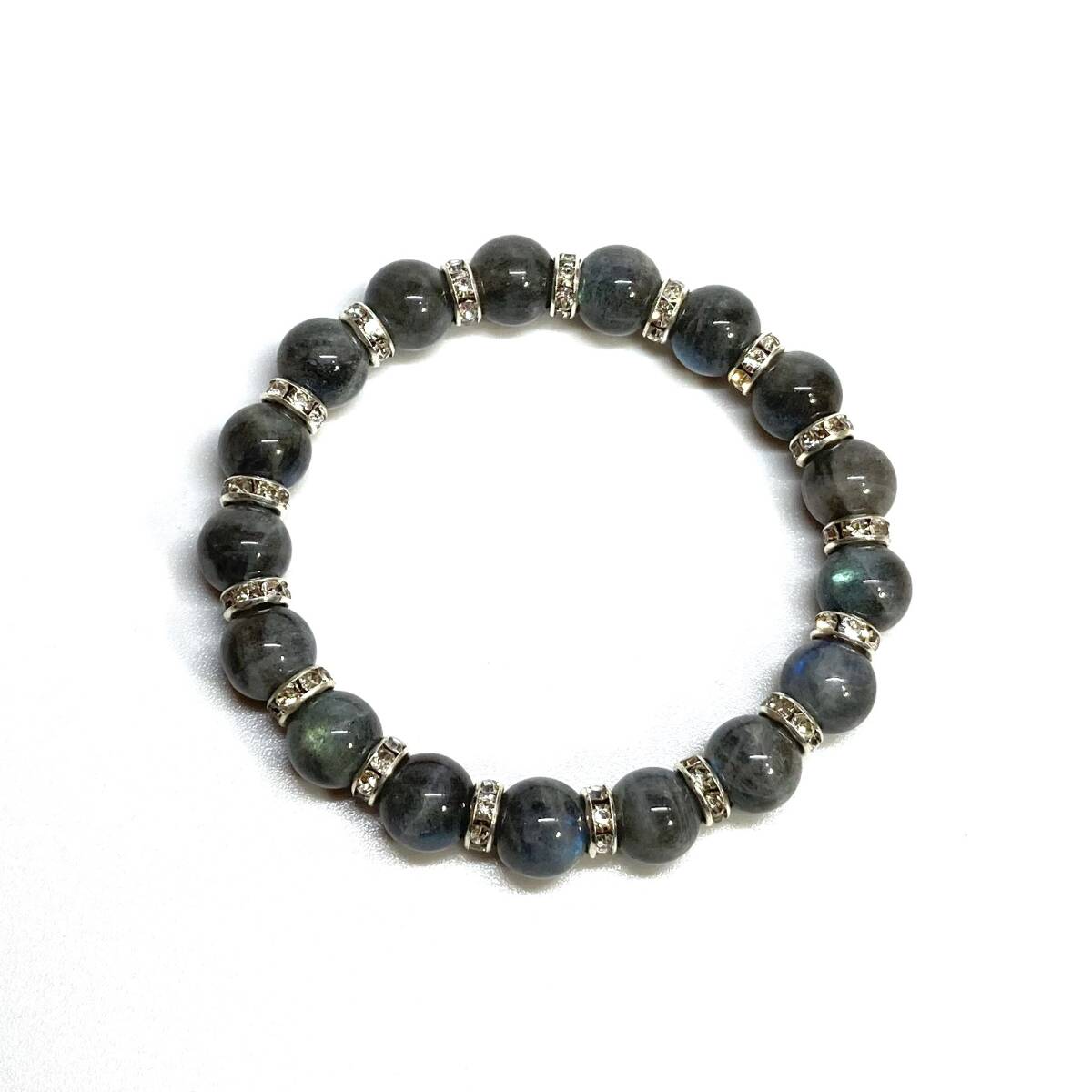こちらは、10mm玉のラブラドライトを使用したパワーストーンブレスレットです。シンプルなデザインは、男女問わずどんなコーディネートとも合わせ易いブレスレットです。サイズは内周約18cmです。数に限りがございますので気になる方はお早めにどうぞ。