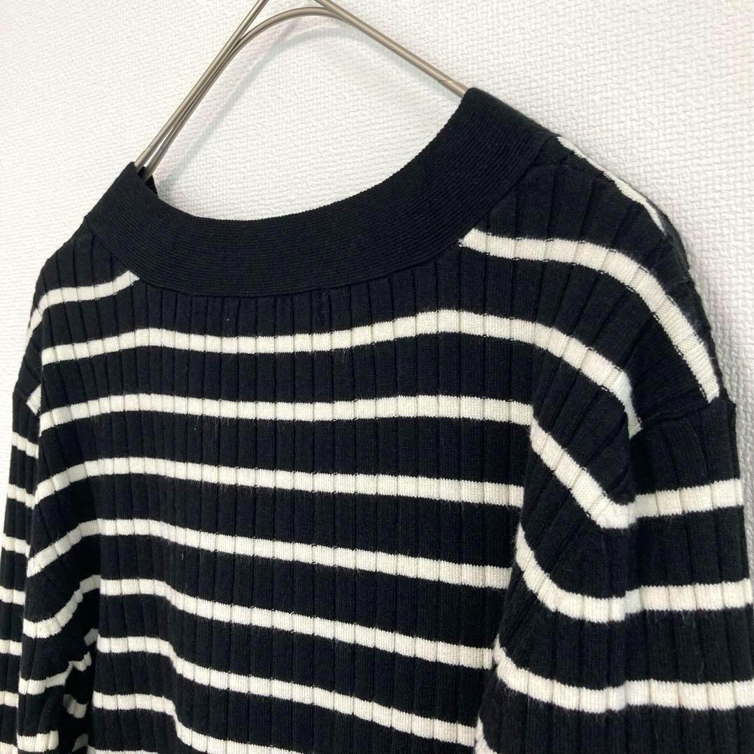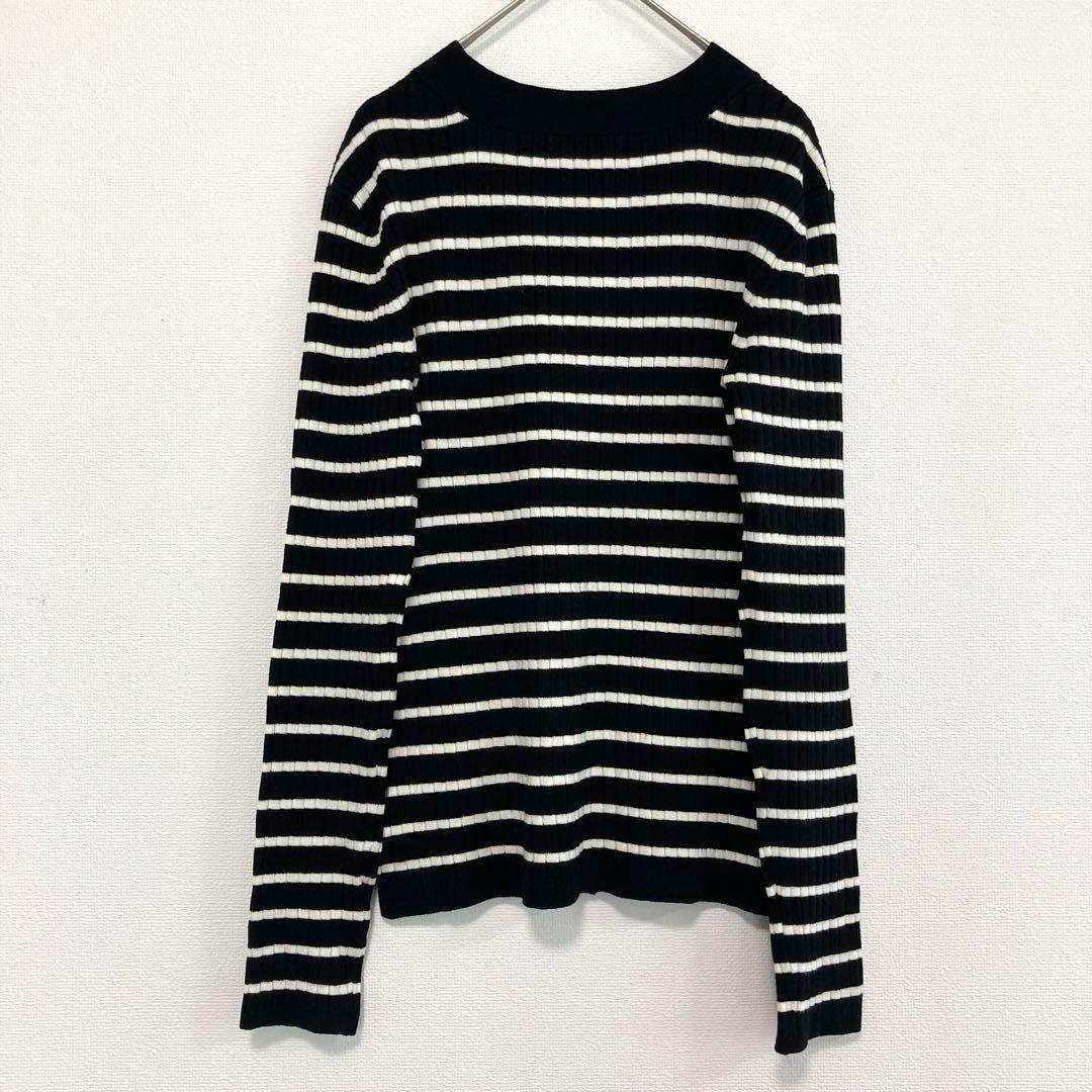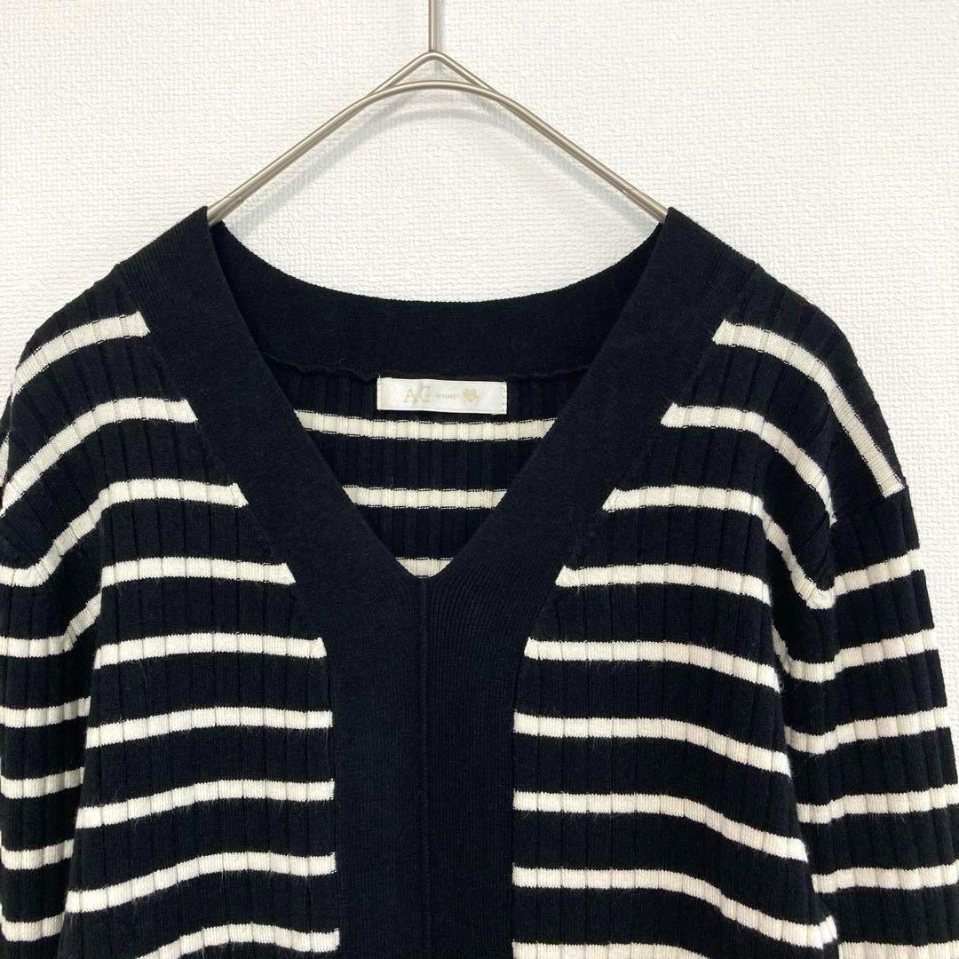 【美品】Vネックボウタイデザイン ボーダー長袖リブニットセーターL 黒白ワールド 0F9D68