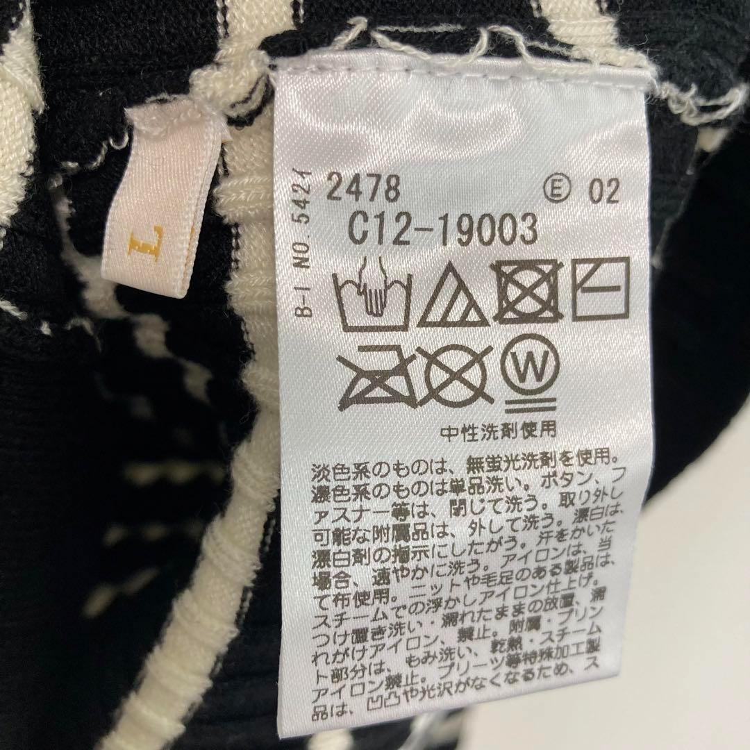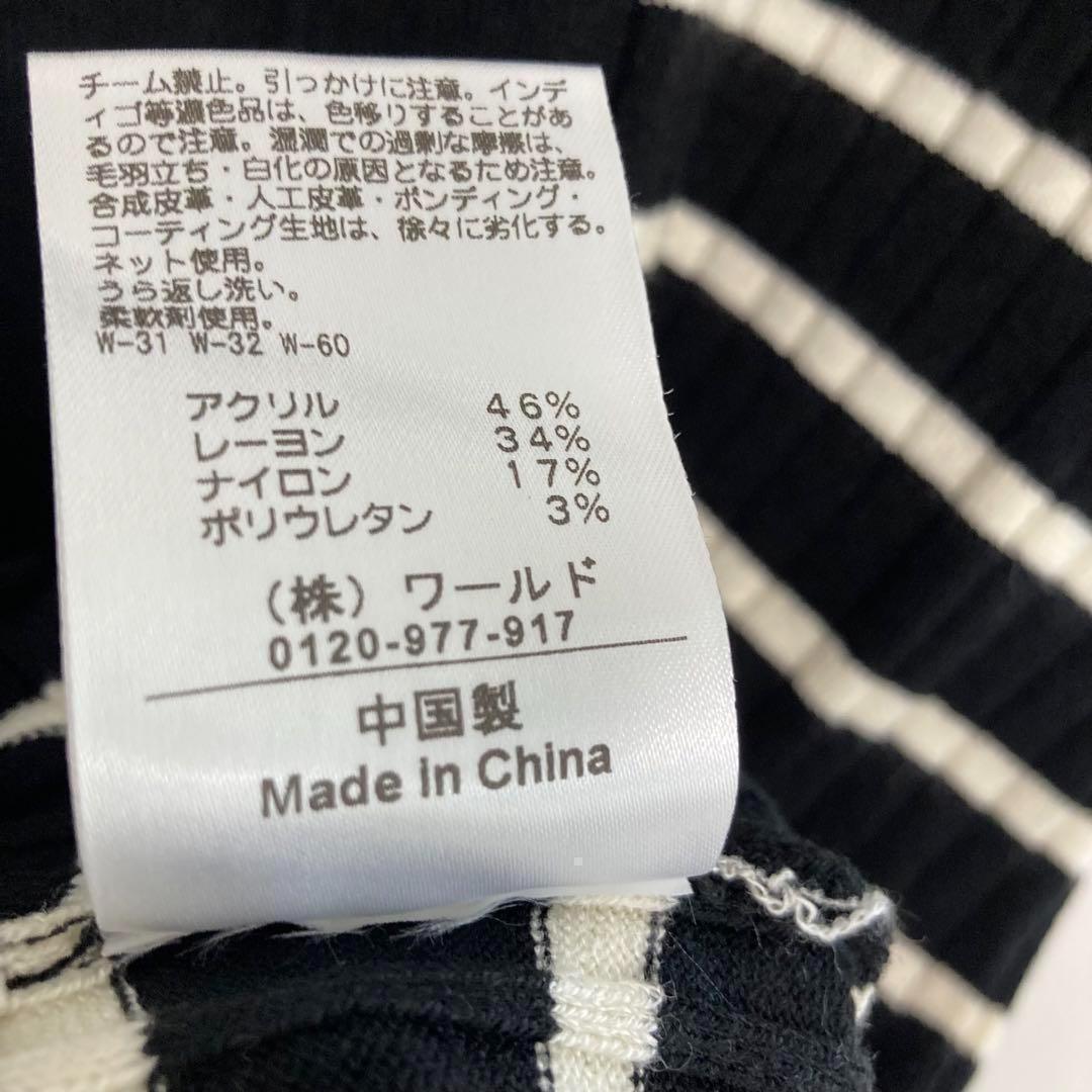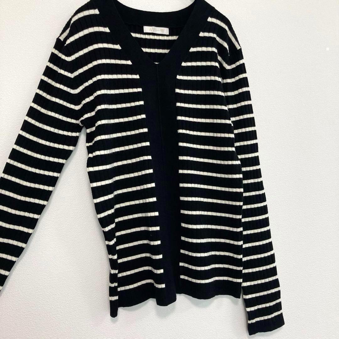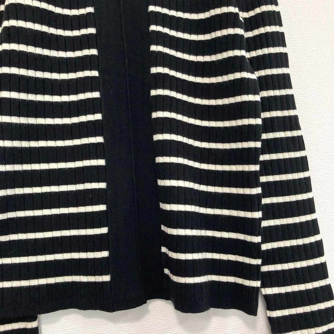 【美品】Vネックボウタイデザイン ボーダー長袖リブニットセーターL 黒白ワールド 0F9D68