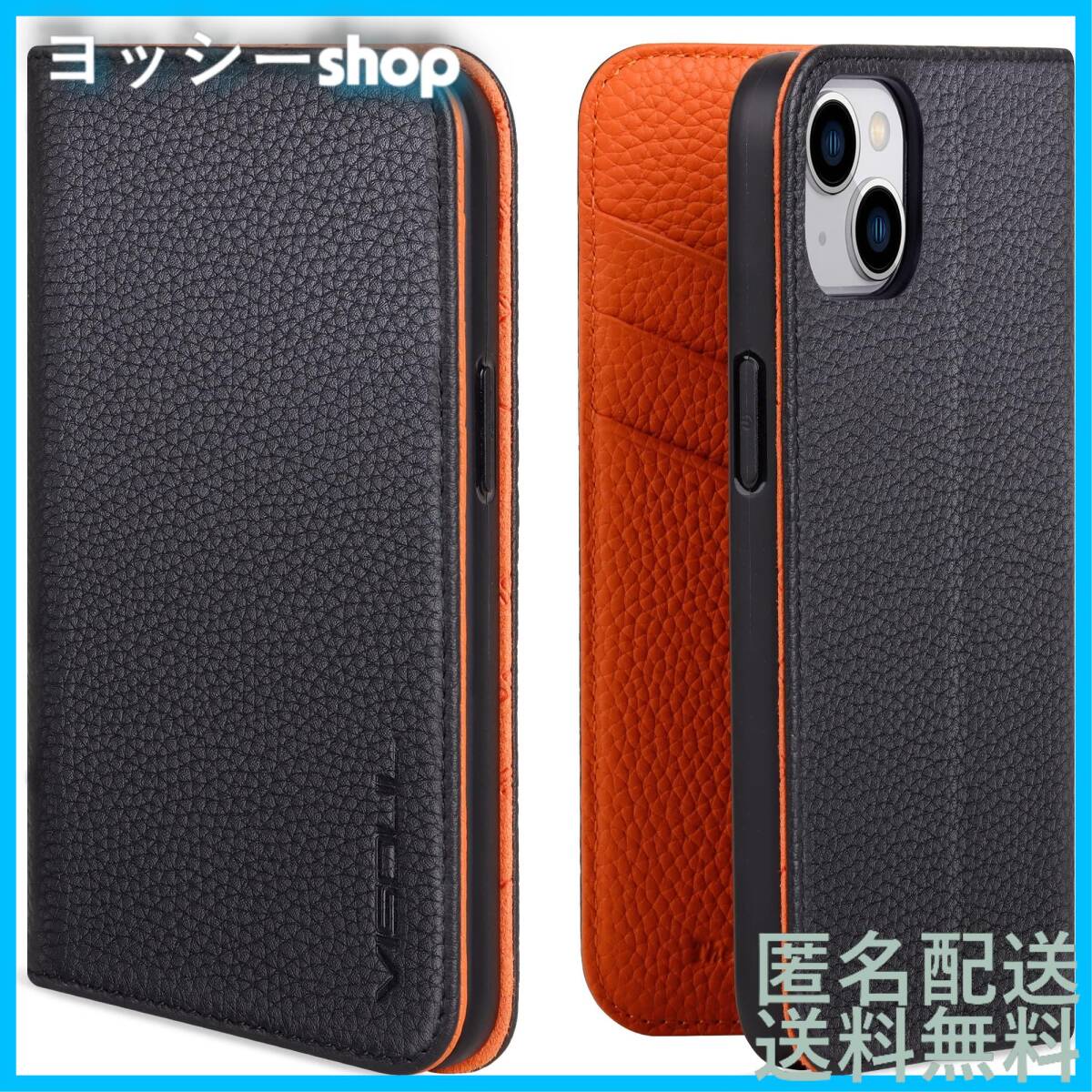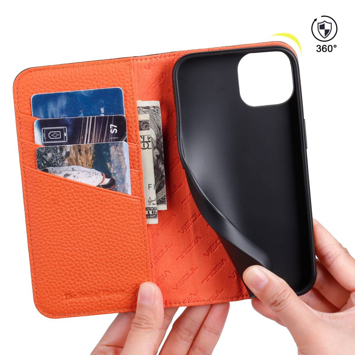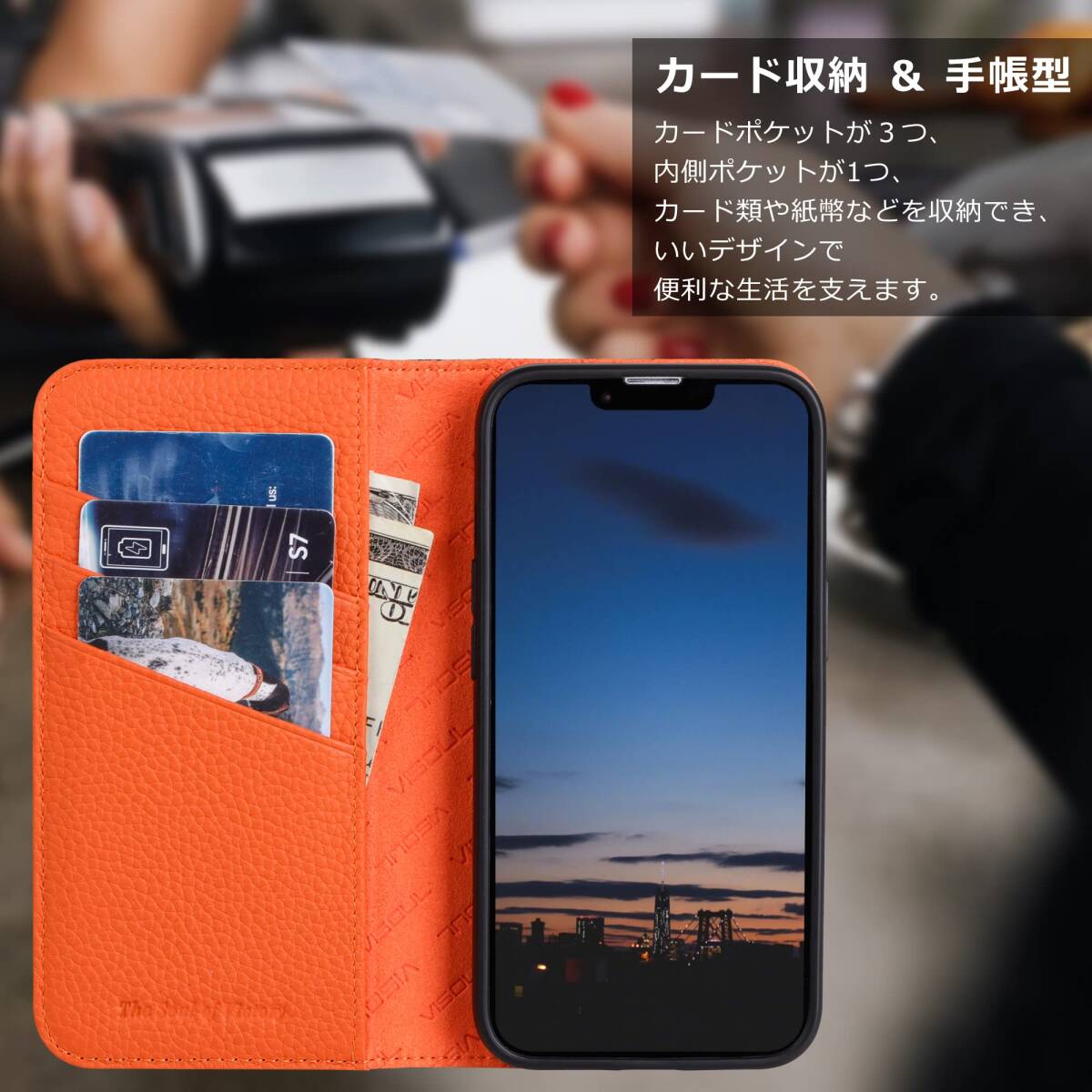 VISOUL iphone14 ケース 本革 スマホケース レザー 手帳型 アイフォン14 カード収納 携帯 全面保護 柔軟なTPU素材 マグネット式 スタンド機能付き アイホン14 対応 6.1インチ オレンジ